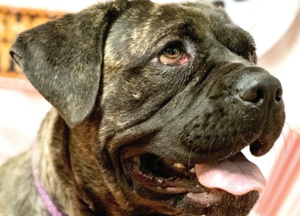 Not rubber and lacks feathers, but with her black brindle fur this Mastiff mix will be the one. 18 mo.