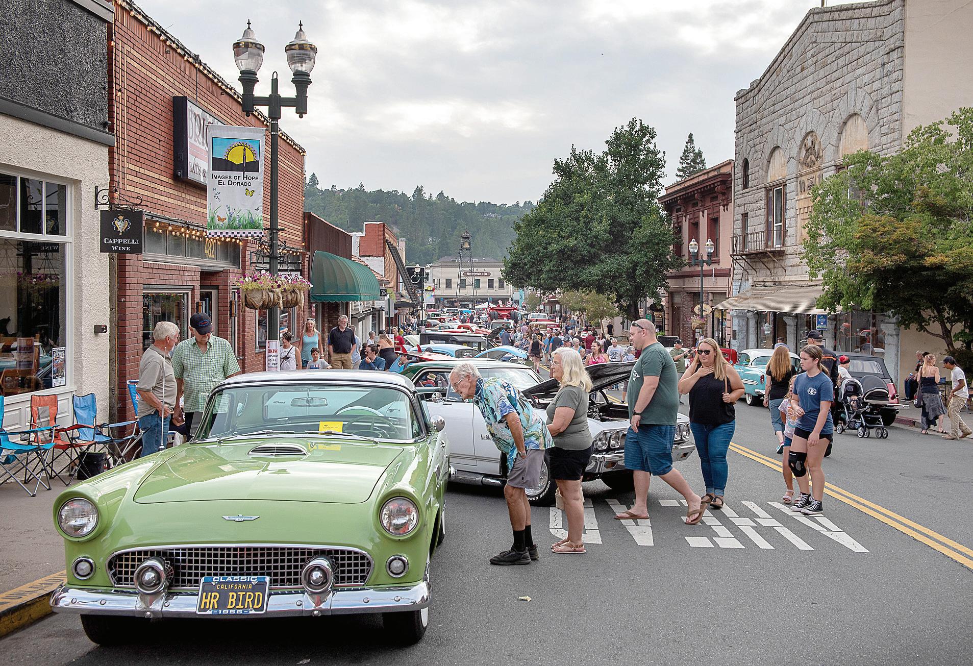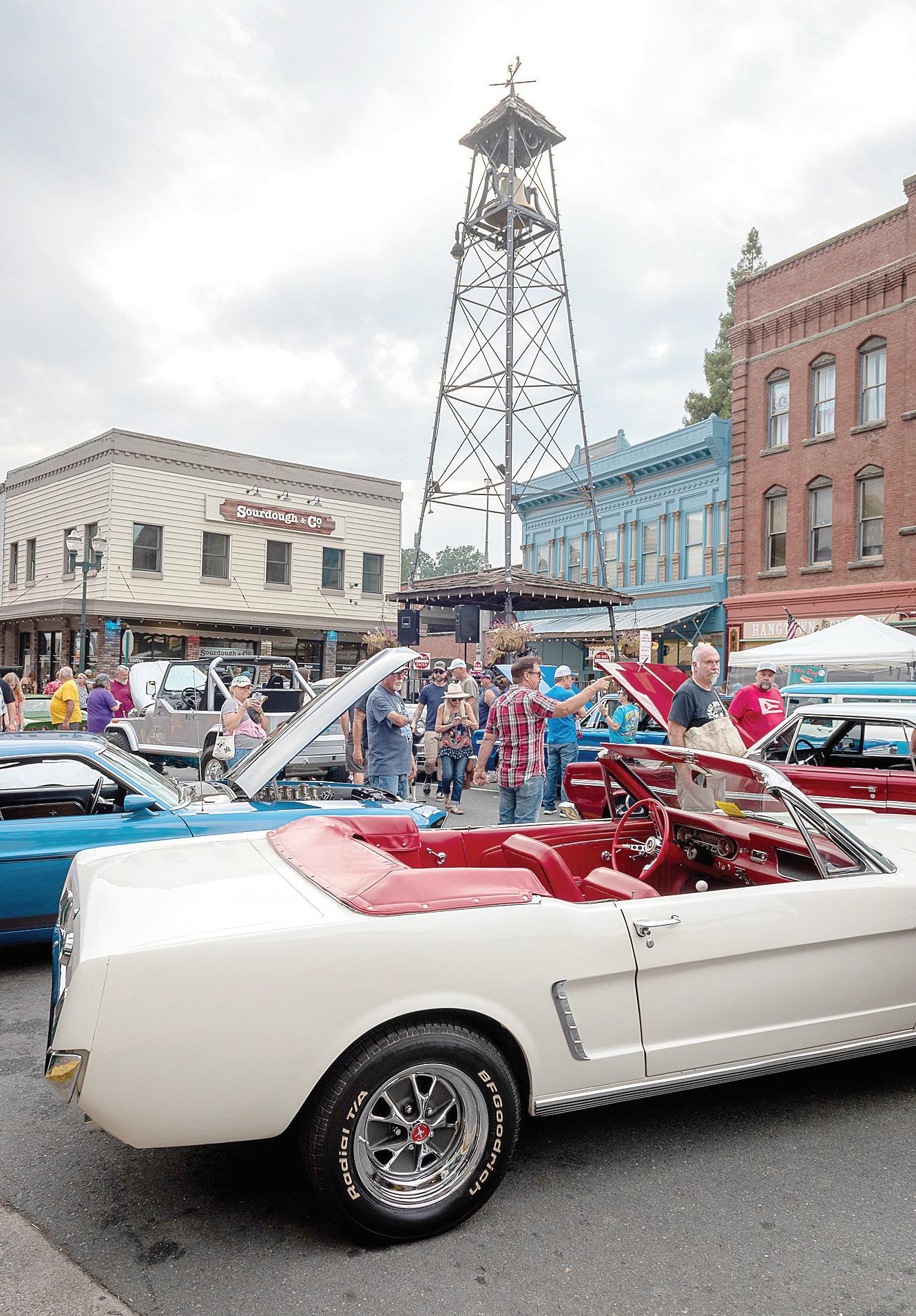 “Which Way” is a 1953 Chevy owned by Chuck Adams, left photo, of West Sacramento. The car is a Chevy front end and 1953 Pontiac front end on the rear. Adams talks shop, right photo, over a 1953 Pontiac front end on the back of his 1953 Chevy. Rad rides were parked along historical Main Street, which was open only to pedestrians for the event. Sandra Morgan’s ‘56 T-Bird was one of the many classic vehicles making an appearance.