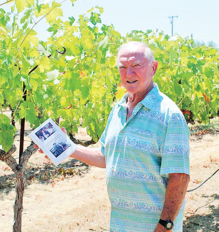 Village Life photo by Isaac Streeter Chuck Huebner poses in his vineyard with his new book “On The Road Again,” a collection of stories detailing his life as a veteran and member of the Secret Service, among other professions.