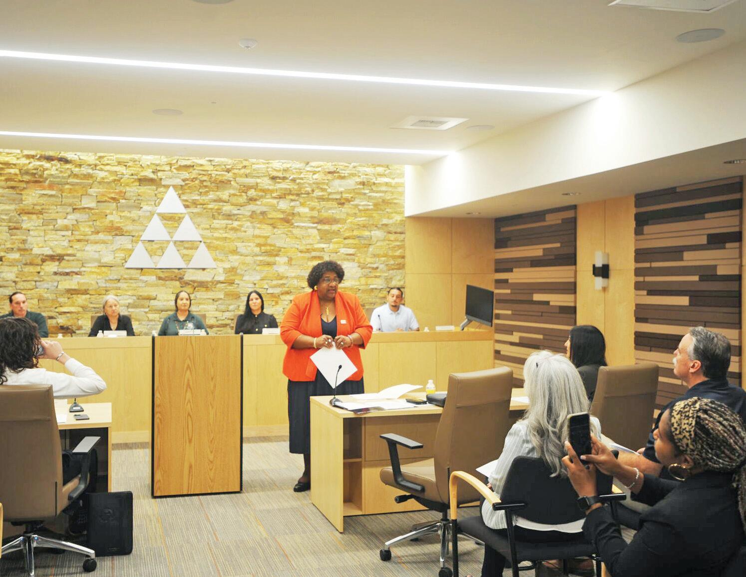 California Secretary of State Shirley N. Weber speaks before the filled council chamber, celebrating the work of the Shingle Springs Band of Miwok Indians Tribal Council. The council passed a resolution Tuesday to establish the first voter registration center in the nation to be located on tribal land.