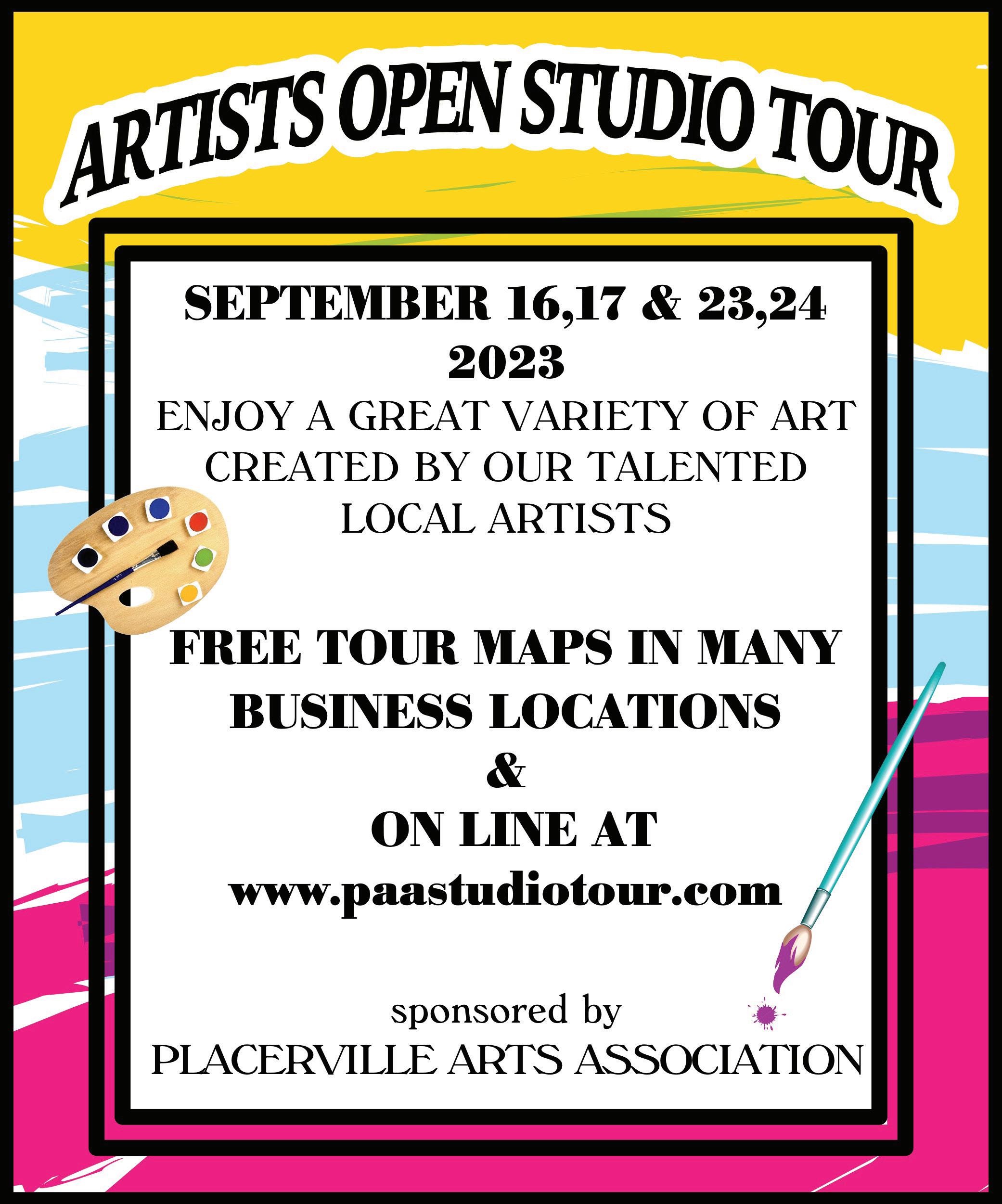 The Placerville Arts Association hosts its 2023 Artists Open Studio Tour, Sept. 23 & 24. For map and complete details go to paastudiotour. com.