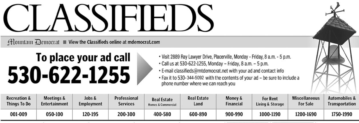 Public Notices • E-mail your public notice to legals@mtdemocrat.net • Be sure to include your name and phone number legal notice continued on the next page The Public Square A local marketplace to find what you are looking for…To post your message, call us at 530-622-1255, Monday - Thursday, 8 a.m. - 4 p.m.; Friday 8 a.m. - 3 p.m. wanna sell? 622-1255 Employment For Rent Free For SaleWanted PLACERVILLE-$1.00 a square foot, includes utilities, 200sf –720sf each, office, storage, light industrial? 4600 Missouri Flat Rd, (530) 622-2640 NEW TODAY FREE TO GOOD HOME ONLY female, fixed cat, 4 yrs old, litter box trained, inside only, Cell phone, text only (530) 391-5200 FOR SALE White Goldendoodle Pups Extra calm temperaments. Parents’ health tested, and potty training begins at 4 weeks. Family raised, low to no shed, hypoallergenic. Male, $1450. Female, $1950. 916-715-9755 goodvibedoodles.com NOW HIRING ASSEMBLY WORKERS $200 SIGN ON BONUS for FULL TIME WORKERS AFTER 90 DAYS. Apply IN PERSON at Applied Control Electronics, 5480 Merchant Circle, Placerville, CA 95667. Monday-Friday 7:30am - 4:00pm WANTED granny studio for retired Christian. I have no pets, I’m a non-smoker, I just have potted plants. Excellent references and credit (530)622-1549 On-Site Mgmt. Cameron Park 1, 2, 3 bedrooms, close to freeway, covered parking and pool. small pets aCCepteD. (530) 677-6210 Cambridge Garden Apartments Solution to Puzzle 1 Solution to Puzzle 2 n sudoku solutions