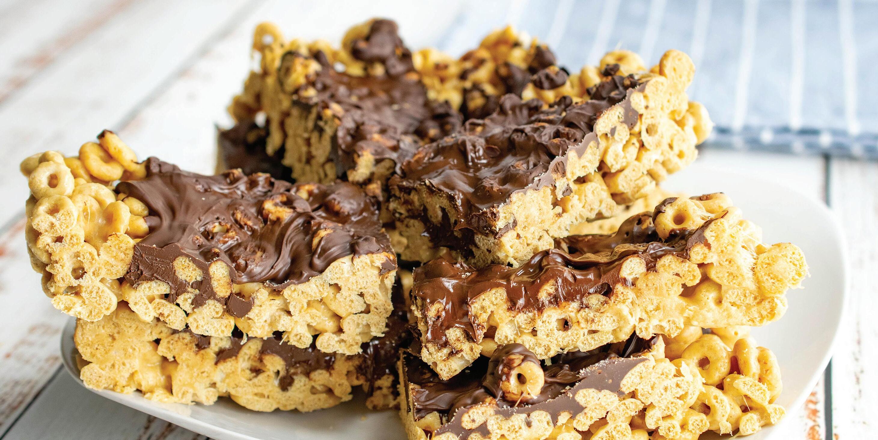 minutes out of your day to make 5-Minute Dark Chocolate Cereal Bars. This quick and simple dessert makes it easy to celebrate the day’s accomplishments without added stress. As a fun way for little ones to help in the kitchen, you can cook together the butter, marshmallows, peanut butter and cereal then let the kiddos drizzle the key ingredient: melted chocolate. All that’s left