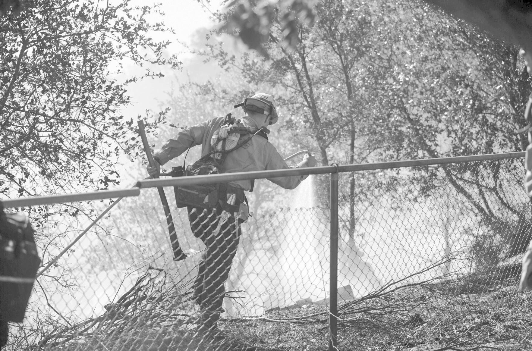 A firefighter douses a hot spot during the Friday firefight.