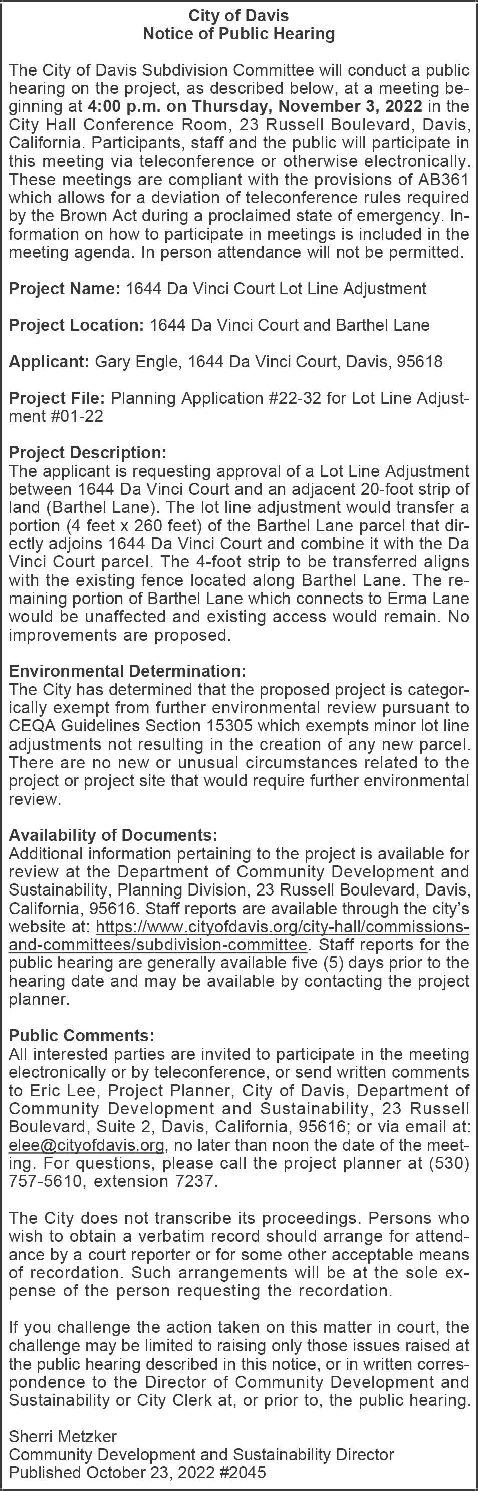 To SUBSCRIBE to The Davis Enterprise, please visit davisenterprise.com/subscribe For LEGAL NOTICES, email legals@davisenterprise.net or call Shawn at 530-747-8061 For CLASSIFIEDS or OBITUARIES, email classads@ davisenterprise.net or obit@davisenterprise.net LOBBY HOURS: Mon. - Fri. 10 a.m. - 3 p.m. THE DAVIS ENTERPRISE SUNDAY, OCTOBER 23, 2022 B7