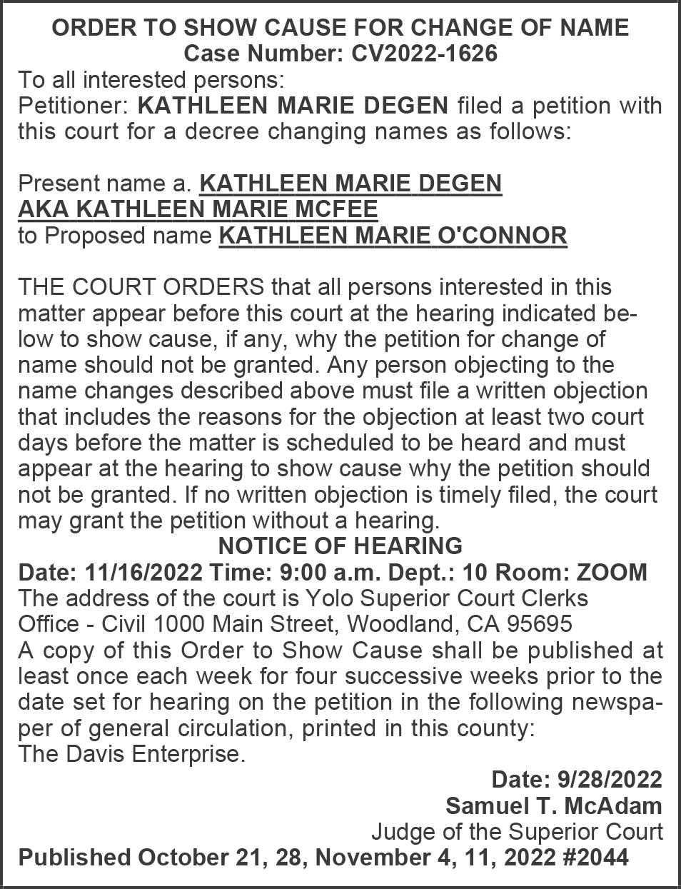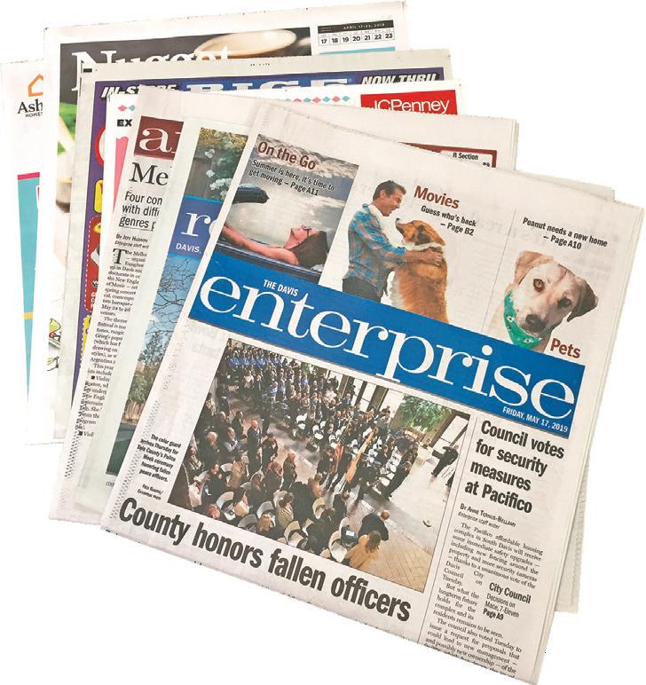 PHONE, MAIL OR IN PERSON Home delivery: 325 G St., 530-756-0826 Delivery phone hours : Mon.-Fri. 9 a.m.-1 p.m.; Sun. 7-10 a.m. Business office : 325 G St. 530-756-0800 Hours: Mon. - Fri. 9 a.m. - 4 p.m. EMAIL News newsroom@davisenterprise.net Sports sports@davisenterprise.net Home Delivery circulation@davisenterprise.net Classifieds classads@davisenterprise.net Advertising ads@davisenterprise.net Legal Notices legals@davisenterprise.net Obituaries obit@davisenterprise.net Production graphics@davisenterprise.net ON THE WEB www.davisenterprise.com Copyright 2022 If you do not receive your Enterprise by 5 p.m. on Wednesdays or Fridays or 7 a.m. on Sundays, please call 530-7560826. Missed issues will be delivered on the next publishing day. HOME DELIVERY HOW TO REACH US About us 2022 Member California News Publishers Association Certified Audit of Circulations A2 THE DAVIS ENTERPRISE FRIDAY, NOVEMBER 11, 2022 The Davis Enterprise is published Wednesdays, Fridays and Sundays by The Davis Enterprise Inc., 325 G Street, Davis, CA 95616. Application to Mail at Periodicals Postage Prices is Pending at Davis, CA. POSTMASTER: Send address changes to to The Davis Enterprise, P.O. Box 1470, Davis, CA 95617-1470. Phone 530-756-0800 R. Burt McNaughton Publisher Sebastian Oñate Editor Nancy Hannell Advertising Director Shawn Collins Production Manager Bob Franks Home Delivery Manager SUBSCRIPTION RATES FOR CARRIER DELIVERY (plus tax) Home delivery $3.69 per week Online $3.23 per week 12 weeks $44.84 24 weeks $89.30 48 weeks $159.79