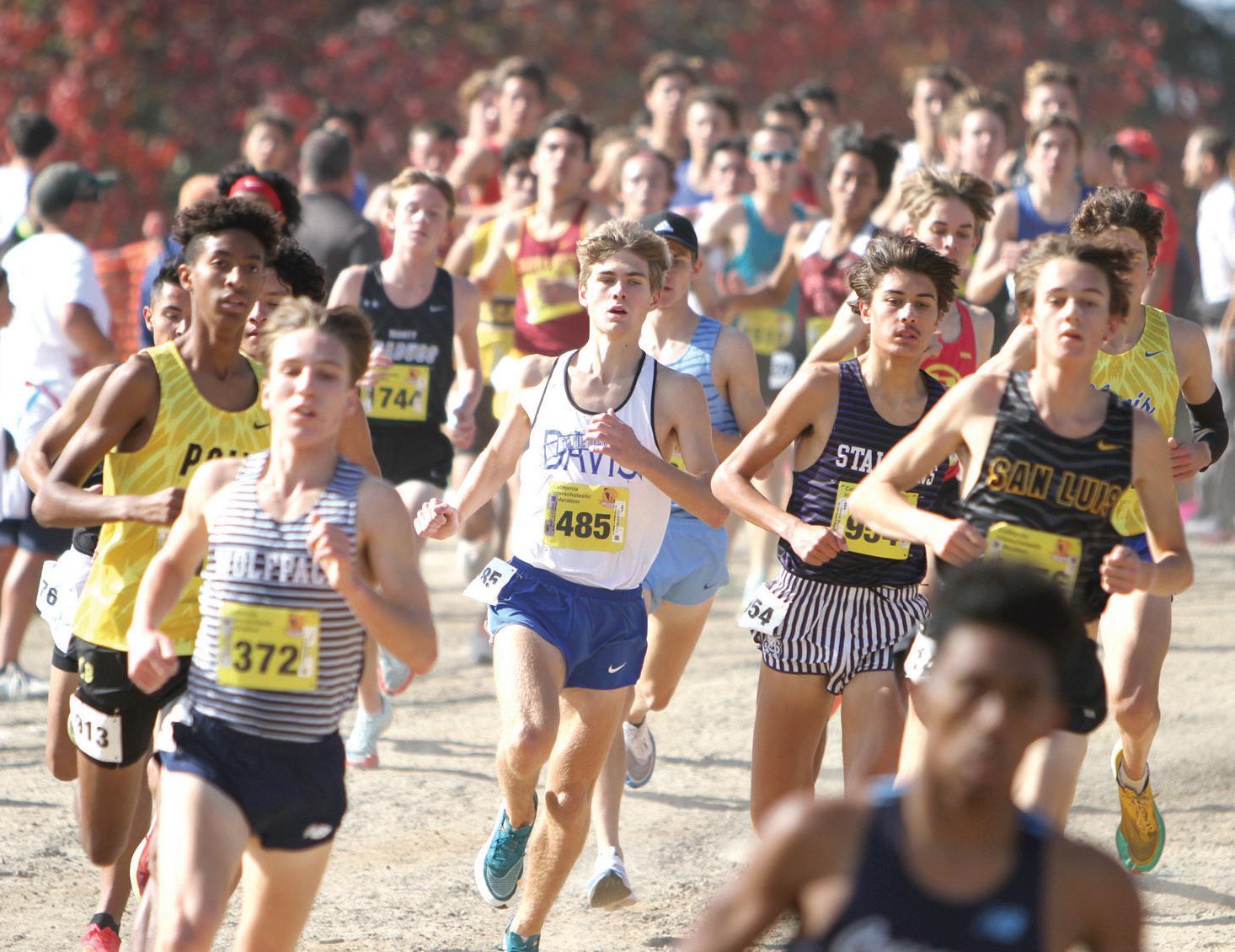 Davis High’s Ryan Mitchell (485) runs with a pack of Division I boys at the California Interscholastic Federation Cross-Country Championships at Woodward Park in Fresno on Saturday. Mitchell, a senior, took 22nd place. The Davis boys, as a team, took 20th place with 447 points.