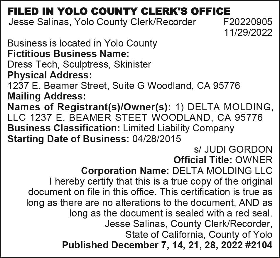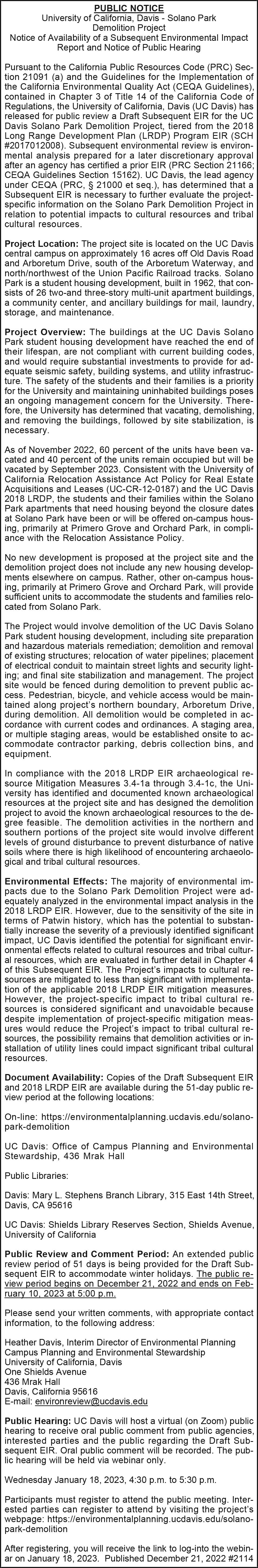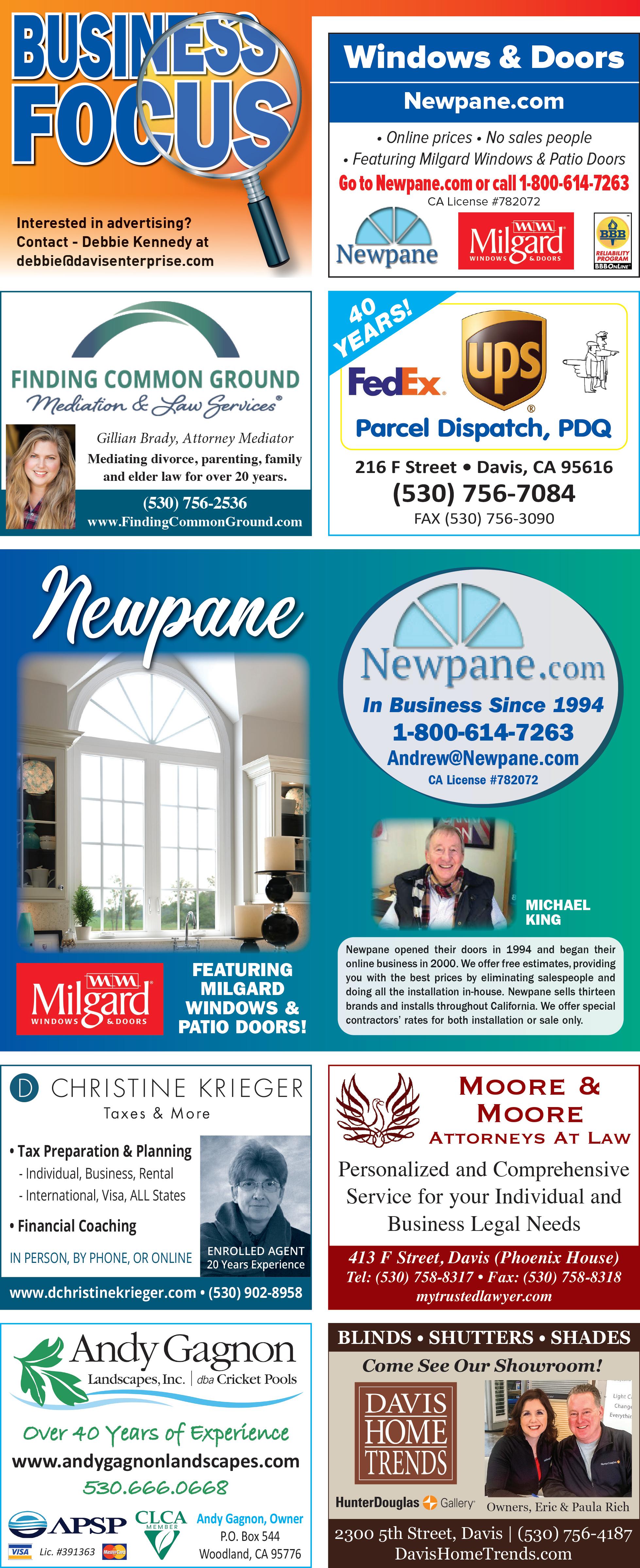 PHONE, MAIL OR IN PERSON Home delivery: 325 G St., 530-756-0826 Delivery phone hours : Mon.-Fri. 9 a.m.-1 p.m.; Sun. 7-10 a.m. Business office : 325 G St. 530-756-0800 Hours: Mon. - Fri. 9 a.m. - 4 p.m. EMAIL News newsroom@davisenterprise.net Sports sports@davisenterprise.net Home Delivery circulation@davisenterprise.net Classifieds classads@davisenterprise.net Advertising ads@davisenterprise.net Legal Notices legals@davisenterprise.net Obituaries obit@davisenterprise.net Production graphics@davisenterprise.net ON THE WEB www.davisenterprise.com Copyright 2022 If you do not receive your Enterprise by 5 p.m. on Wednesdays or Fridays or 7 a.m. on Sundays, please call 530-7560826. Missed issues will be delivered on the next publishing day. HOME DELIVERY HOW TO REACH US About us 2022 Member California News Publishers Association Certified Audit of Circulations A2 THE DAVIS ENTERPRISE WEDNESDAY, DECEMBER 21, 2022 The Davis Enterprise is published Wednesdays, Fridays and Sundays by The Davis Enterprise Inc., 315 G Street, Davis, CA 95616. Application to Mail at Periodicals Postage Prices is Pending at Davis, CA. POSTMASTER: Send address changes to to The Davis Enterprise, P.O. Box 1470,