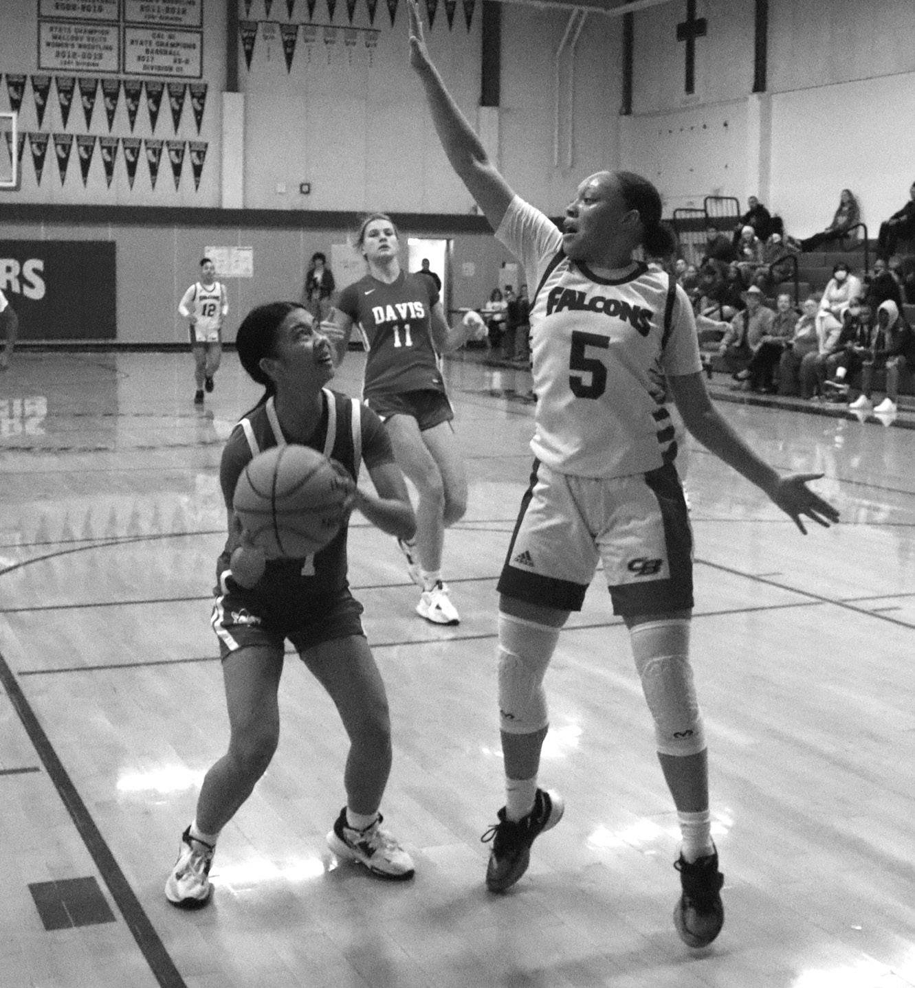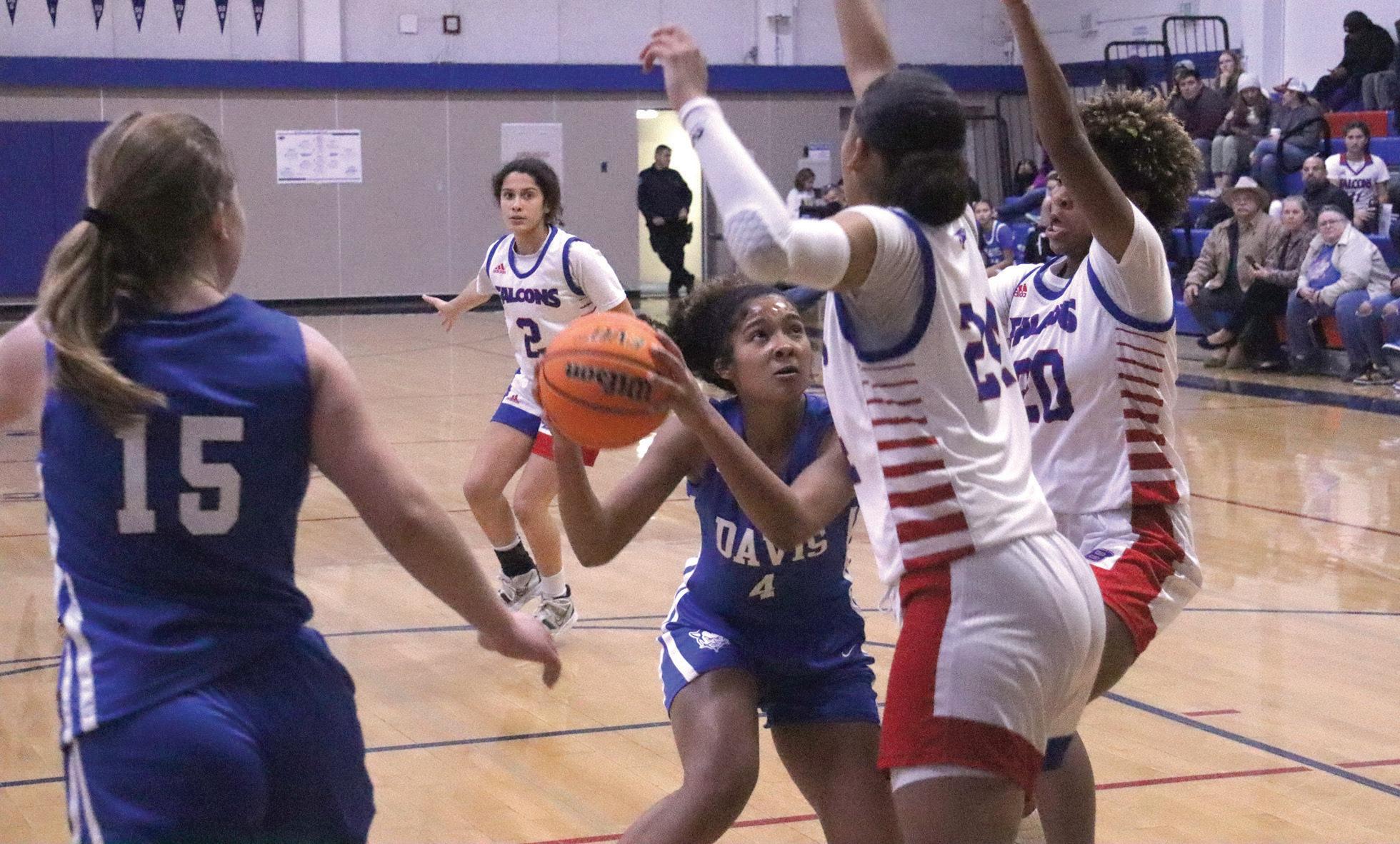 Davis forward Jiana Trotman (4) eyes the basket while trying to fend off two Christian Brothers players in Wednesday’s game inside Ron Limeberger Gym. Looking is Blue Devils guard Izzy Cherry (15).