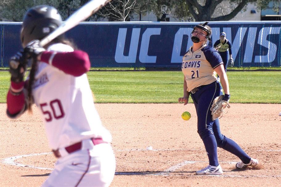 AryA LALvAni/enterprise photo UC Davis pitcher Caroline Grimes unleashes a pitch in Sunday’s game against Santa Clara at La Rue Field.
