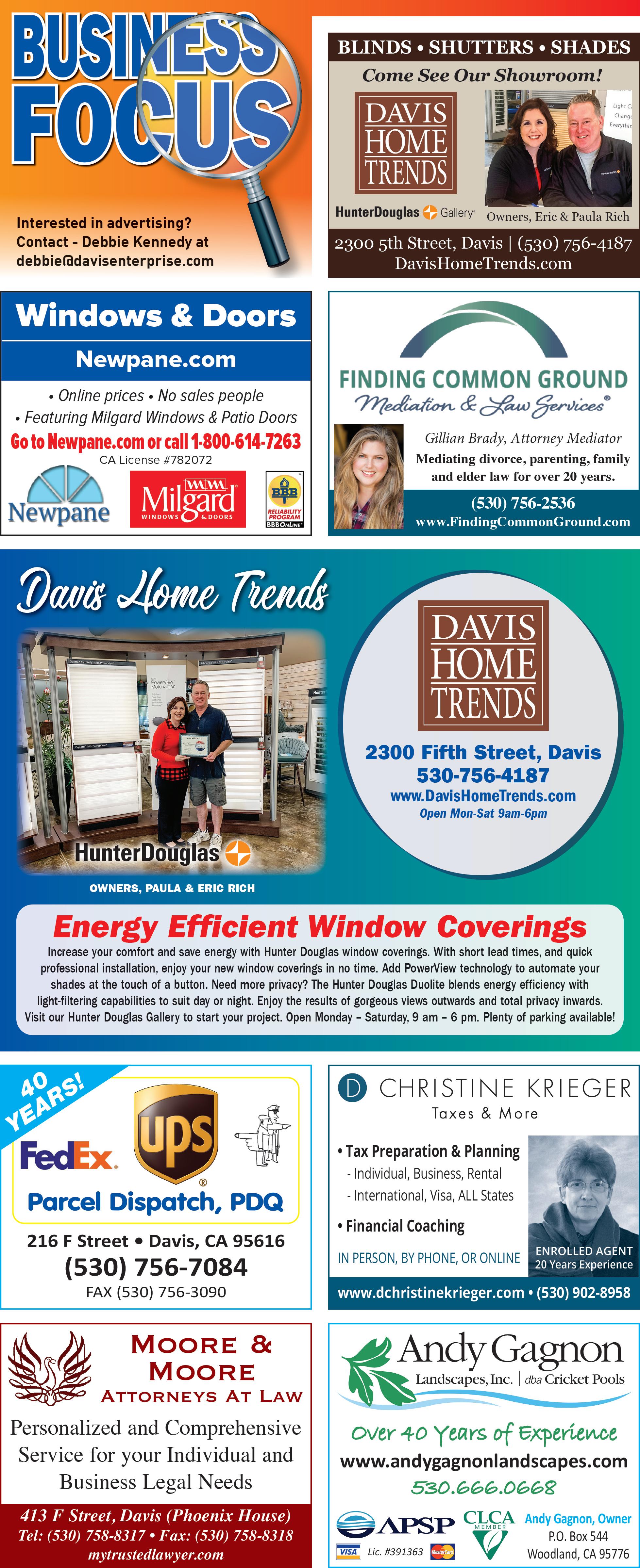 PHONE, MAIL OR EMAIL Home delivery: 530-756-0826; P.O. Box 1470 Davis, CA 95617-1470 Delivery phone hours : Mon.-Fri. 9 a.m.-1 p.m.; Sun. 7-10 a.m. Business office: 530-756-0800 Hours: Mon. - Fri. 9 a.m. - 4 p.m. EMAIL News newsroom@davisenterprise.net Sports sports@davisenterprise.net Home Delivery circulation@davisenterprise.net Classifieds classads@davisenterprise.net Advertising ads@davisenterprise.net Legal Notices legals@davisenterprise.net Obituaries obit@davisenterprise.net Production graphics@davisenterprise.net ON THE WEB www.davisenterprise.com Copyright 2023 If you do not receive your Enterprise by 5 p.m. on Wednesdays or Fridays or 7 a.m. on Sundays, please call 530-7560826. Missed issues will be delivered on the next publishing day. HOME DELIVERY HOW TO REACH US