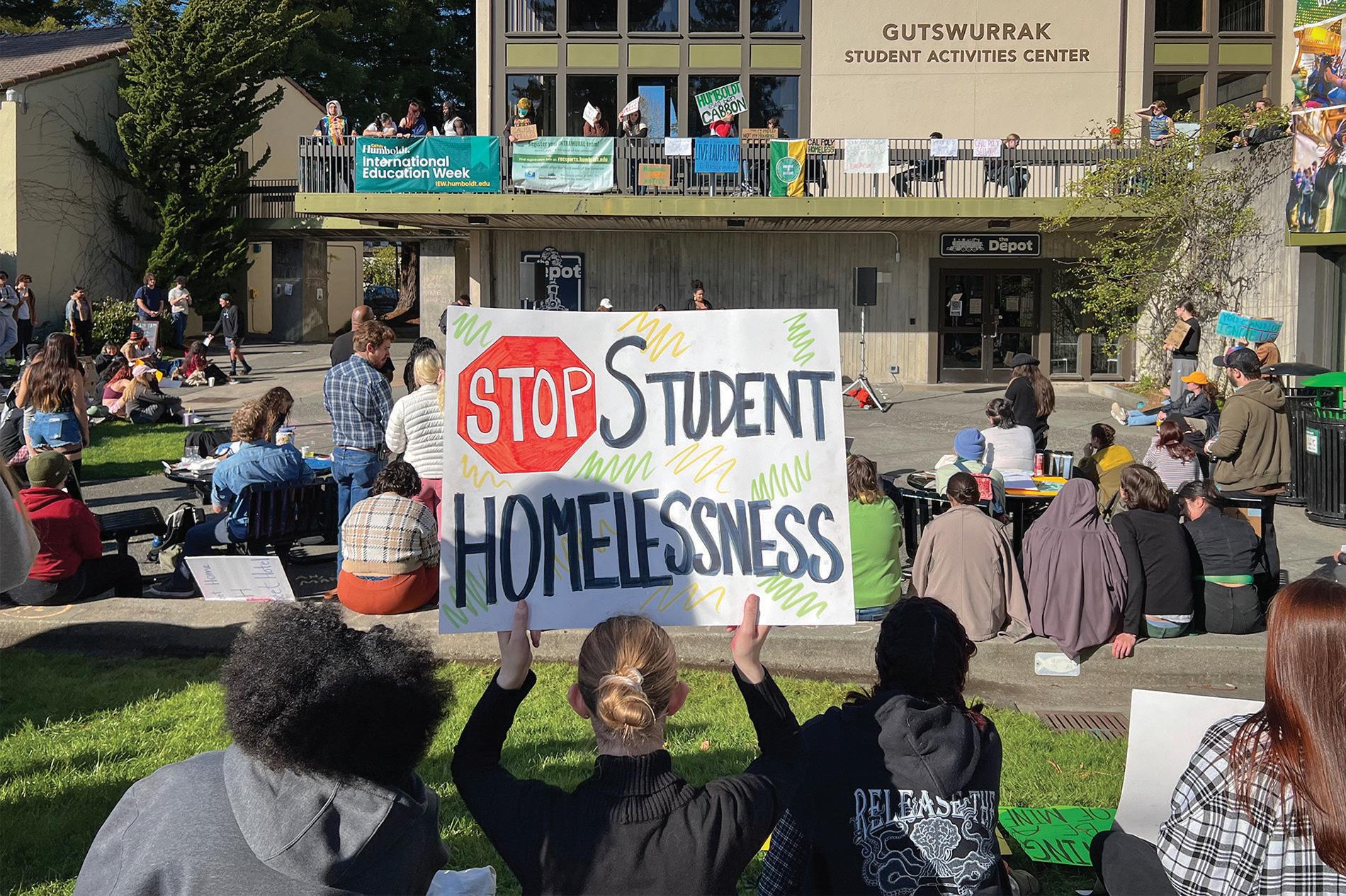 Hundreds of Cal Poly Humboldt students and campus community members protest at the campus quad on Feb. 8. against a housing policy change that left continuing students unsure where they would live next semester.
