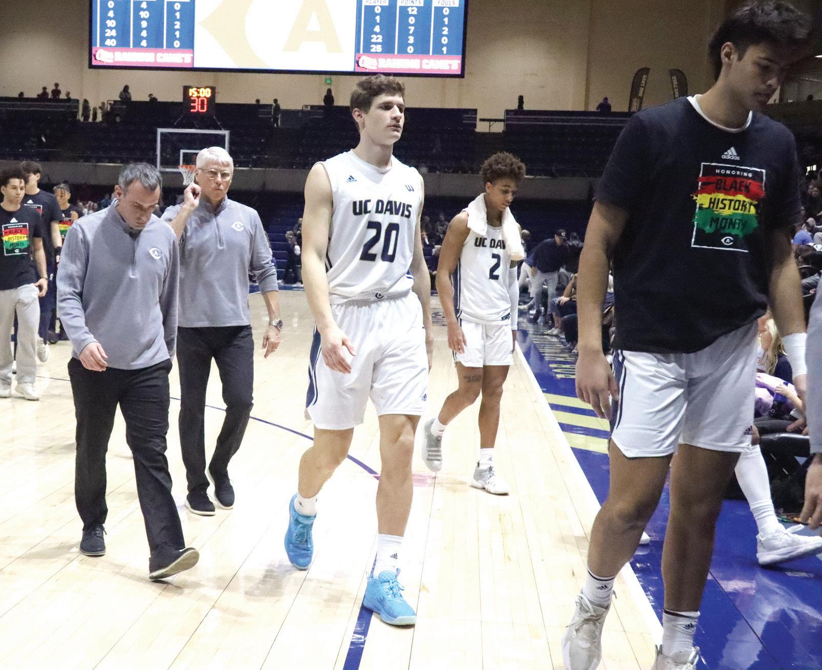 UC Davis men’s basketball head coach Jim Les (middle) joins his assistant coaches and players walking off the court at halftime of Monday’s Big West Conference home game against UC San Diego at the University Credit Union Center.