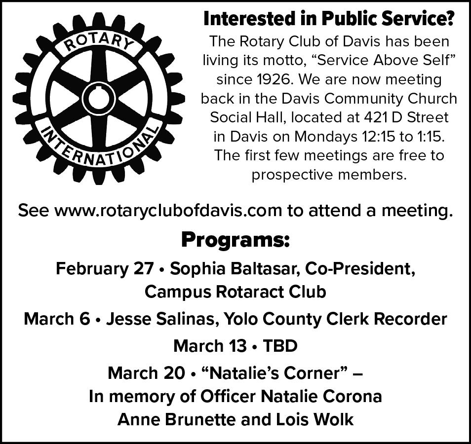 INDEX HOW TO REACH US www.davisenterprise.com Main line: 530-756-0800 Circulation: 530-756-0826 http://facebook.com/ TheDavisEnterpriseNewspaper http://twitter.com/D_Enterprise VOL. 125 NO. 24 Saturday: Frost, then partly sunny. High 51. Low 38. WEATHER Arts B1 Classifieds B4 Comics B3 Dial-a-Pro B6 Forum A4 Movies B1 Obituary A3 Pets A6 Sports B6 WED • FRI • $1 en erprise FRIDAY, FEBRUARY 24, 2023 THE DAVISt