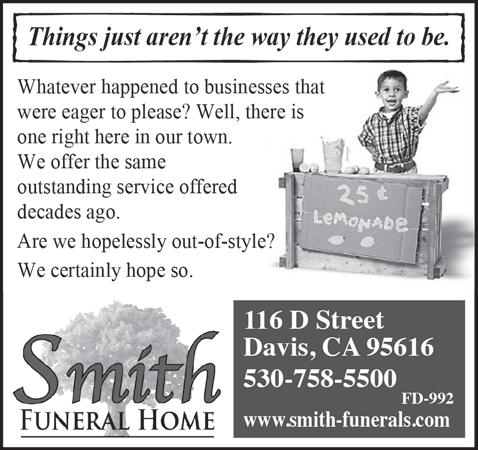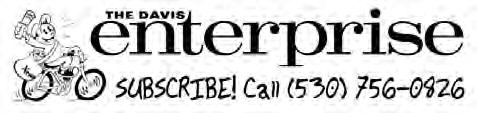 PHONE, MAIL OR EMAIL Home delivery: 530-756-0826; P.O. Box 1470 Davis, CA 95617-1470 Delivery phone hours : Mon.-Fri. 9 a.m.-1 p.m.; Sun. 7-10 a.m. Business office: 530-756-0800 Hours: Mon. - Fri. 9 a.m. - 4 p.m. EMAIL News newsroom@davisenterprise.net Sports sports@davisenterprise.net Home Delivery circulation@davisenterprise.net Classifieds classads@davisenterprise.net Advertising ads@davisenterprise.net Legal Notices legals@davisenterprise.net Obituaries obit@davisenterprise.net Production graphics@davisenterprise.net www.davisenterprise.com Copyright 2023 If you do not receive your Enterprise by 5 p.m. on Wednesdays or Fridays or 7 a.m. on Sundays, please call 530-7560826. Missed issues will be delivered on the next publishing day. HOME DELIVERY HOW TO REACH US About us 2023 Member California News Publishers Association Certified Audit of Circulations A2 THE DAVIS ENTERPRISE SUNDAY, MARCH 5, 2023 The Davis Enterprise is published Wednesdays, Fridays and Sundays by The Davis Enterprise Inc., 315 G Street, Davis, CA 95616. Application to Mail at Periodicals Postage Prices is Pending at Davis, CA. POSTMASTER: Send address changes to to The Davis Enterprise, P.O. Box 1470, Davis, CA 95617-1470. Phone 530-756-0800 R. Burt McNaughton Publisher Sebastian Oñate Editor Shawn Collins Production Manager Louis Codone Advertising Director Bob Franks Home Delivery Manager SUBSCRIPTION RATES FOR CARRIER DELIVERY (plus tax) Home delivery $3.69 per week Online $3.23 per week 12 weeks $44.84 24 weeks $89.30 48 weeks $159.79