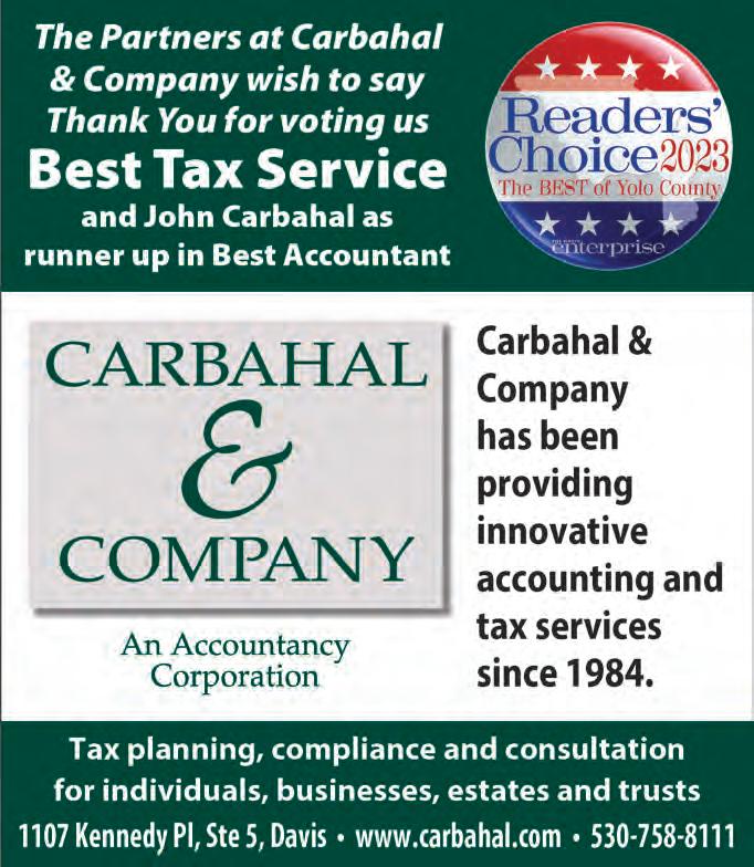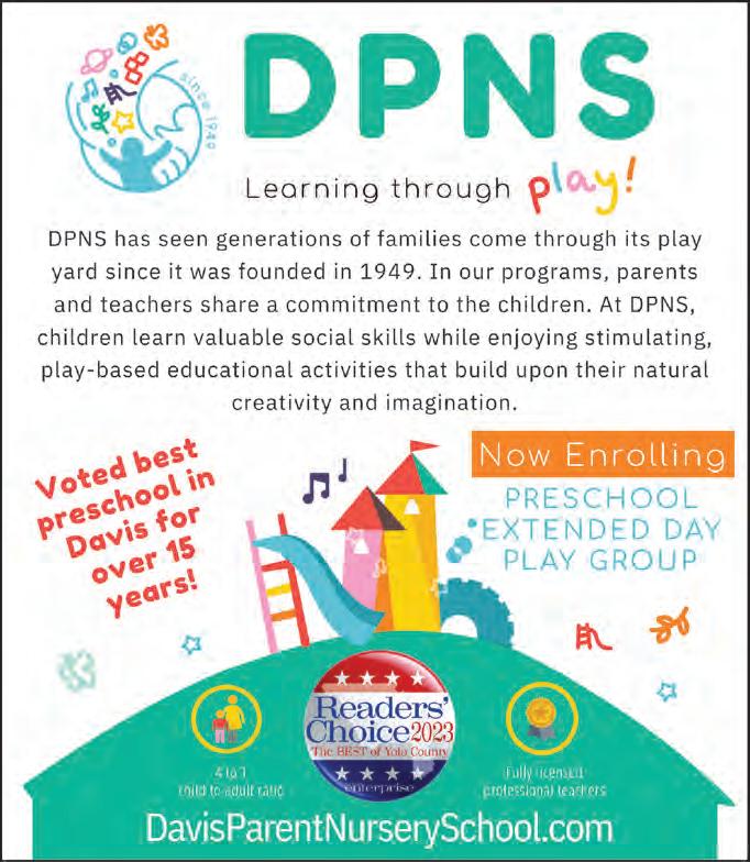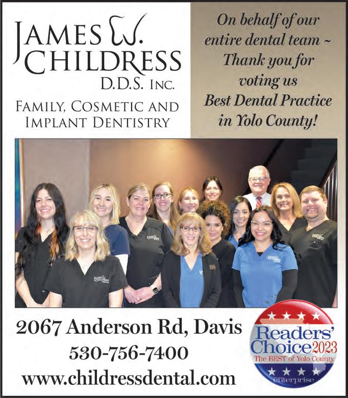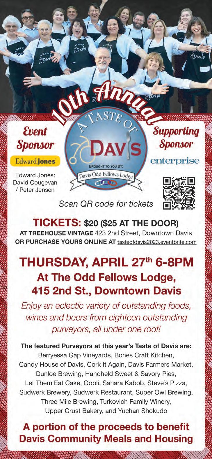 2023 Member California News Publishers Association Certified Audit of Circulations A2 THE DAVIS ENTERPRISE SUNDAY, MARCH 26, 2023 The Davis Enterprise is published Wednesdays, Fridays and Sundays by The Davis Enterprise Inc., 315 G Street, Davis, CA 95616. Application to Mail at Periodicals Postage Prices is Pending at Davis, CA. POSTMASTER: Send address changes to to The Davis Enterprise, P.O. Box 1470, Davis, CA 95617-1470. Phone 530-756-0800 R. Burt McNaughton Publisher Sebastian Oñate Editor Shawn Collins Production Manager Louis Codone Advertising Director Bob Franks Home Delivery Manager SUBSCRIPTION RATES FOR CARRIER DELIVERY (plus tax) Home delivery $3.69 per week Online $3.23 per week 12 weeks $44.84 24 weeks $89.30 48 weeks $159.79