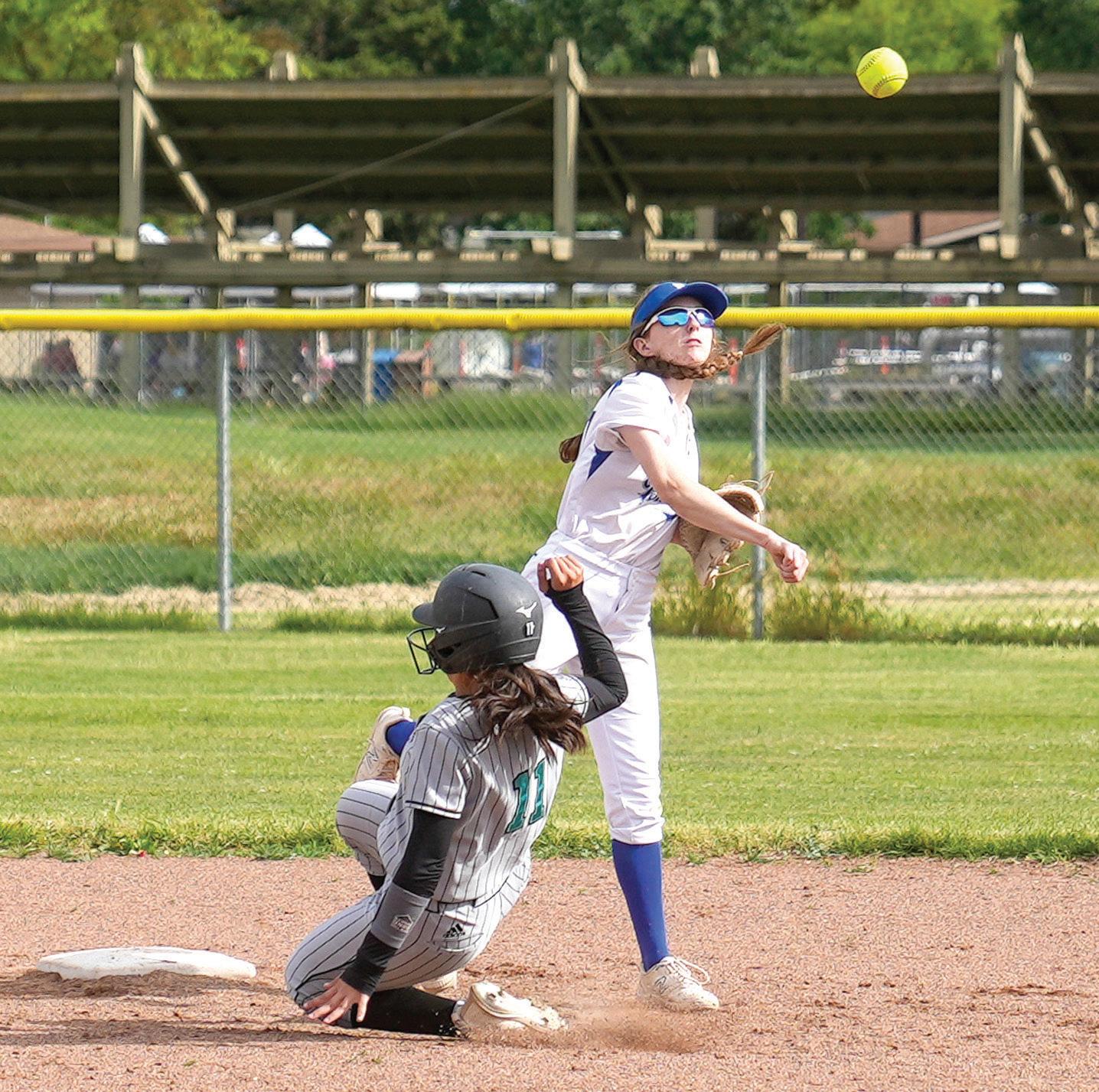 Davis High second baseman Hannah Fox getes the Sheldon runner at second base in Wednesday’s Delta League game. But the visiting Huskies got the win.