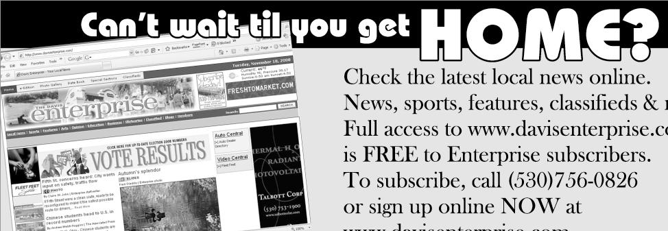 INDEX HOW TO REACH US www.davisenterprise.com Main line: 530-756-0800 Circulation: 530-756-0826 http://facebook.com/ TheDavisEnterpriseNewspaper http://twitter.com/D_Enterprise VOL. 125 NO. 84 Thursday: Sunny and hot. High 96. Low 63. WEATHER Business Focus A6 Classifieds A4 Comics B5 Forum B3 Living B4 Obituaries A5 Senior Living B6 Sports B1 The Wary I A2 WED • FRI • $1 en