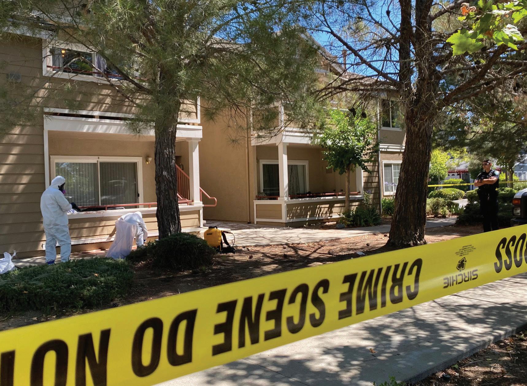 A crime-scene cleanup crew goes over the scene of a stabbing in Davis on Sunday.