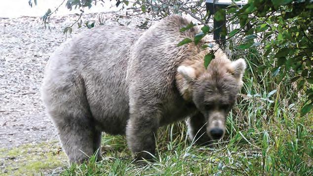 With October approaching, the park’s 2,200 brown bears need to pack on a few final pounds before winter hiberna tion, during which they neither eat nor drink, but live off their stored fat. When spring arrives, they will have lost a third of their weight, and the salmon feeding frenzy will begin again. The bears will need to eat a year’s worth of food in the next six months.