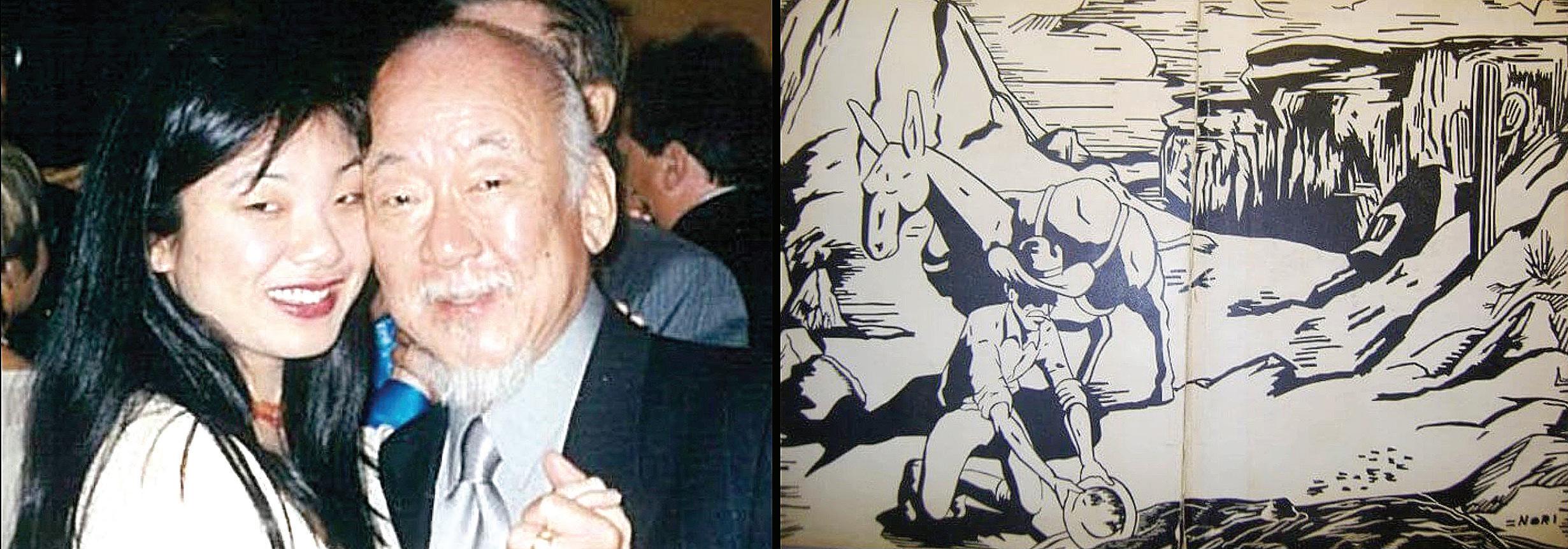 Aly Morita, left, dancing with her father, Pat Morita; the back inside cover illustration in the 1949 Armijo yearbook drawn by Pat Morita.