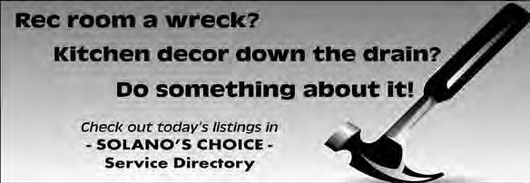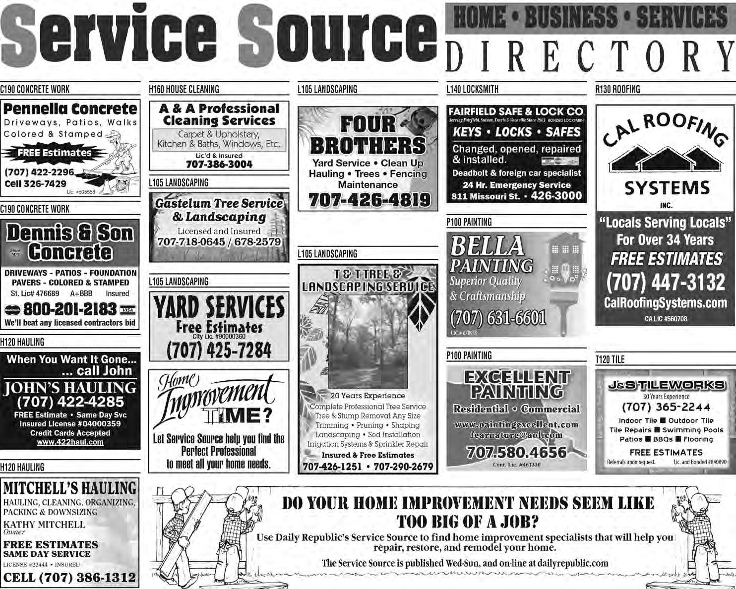 tect the people of California from unlawful discrimination in employment, housing and public accommodations. The Daily Republic will not knowingly accept any ad which is in violation of the Federal Fair Housing Act and the California Fair Employment and Housing Act which ban discrimination based on race, color, national origin, sex, r eligion, sexual orientation, age, disability, familial status, and marital status. Describe the Property Not the Tenant 0347 VACATION RENTALS C o s t a R i c a T o u r 9 D a y s $ 9 9 5 Fully guided tour. Includes all hotels, all meals, all activities. Tax, fees extra. Call 1-800-CARAVAN. Book online at Caravan.com (Cal-SCAN) 0401 BUSINESS OPPORTUNITY Become a Published A uthor. We want to Read Your Book! Dorrance Publishing-Trust ed by Authors Sinc e 1920 Book manuscript submissions currently being reviewed. Comp rehensive Services : Consultation, Product ion, Promotion and D istribution. Call for Y our Free Author's Guide 1-877-538-9554 o r visit http://dorr anceinfo.com/Cali (Cal-SCAN) 0401 BUSINESS OPPORTUNITY RETIRED COUPLE $$$$ for business pur pose Real Estate loans Credit unimportant V.I.P. Trust Deed Company www.vip loan.com Call 1-818-248-0000 Broker-principa l DRE 01041073. N o consumer loans. (Cal-SCAN) 0407 FIN. SERV. & INVESTMENTS Over $10K in Debt? Be debt free in 24 to 4 8 months. No upfron t fees to enroll. A+BB B rates. Call Nationa l Debt Relief 1-888-231-4274. (Cal-SCAN) 0509 MISCELLA NEOUS SERVICES DENTALINSURANCEfromPhysi ciansMutualInsur anceCompany Coveragefor35 0 plusprocedures Realdentalinsur ance-NOTjust a discountplan.D o notwait!Callnow ! GetyourFRE E DentalInformatio n Kitwithallthede tails! 1-855-993-041 3 www.dental50plus.c om/republic#6258 Get DIRECTV for $ 64.99/mo for 12 m onths with CHOICE Package. Save a addit ional $120 over 1st year. Frist 3 months of H BO Max, Cinemax S howtime, Starz and Epix included! Directv is #1 in Customer Satisfaction (JD Power & Assoc.) Some restrictions apply. Call: 1-888-641-5762 (Cal-SCAN) 0509 MISCELLA NEOUS SERVICES Offer your home improvement expertise & services in Solano County's largest circulated newspaper. Achieve great results by advertising in Service Source Call M F 9am 5pm (707) 427 6922 Up to $15,000.00 of GUARANTEED Life Insurance! No medical exam or health questions. Cash to help pay funeral and other final expenses.Call Physi cians Life Insurance Company- 866-6040688 or visi t www.Life55plus.info/d ailyrep 0625 COMPUTERS COMPUTER & IT TRAINING PROGRAM! T rain ONLINE to ge t the skills to become a Computer & Help Desk P rofessional now ! G rants and Scholar ships available for cer tain programs for qual i fied applicants. Cal l CTI for details! 1-877 8 06-0935 (M-F 8am 6 pm ET). Compute r w ith internet is re q uired. (Cal-SCAN) 0627 ELECTRONICS Switch and save up to 250/year on your talk text and data. No contract and no hidden fees. Unlimited talk and text with flexibl e data plans. Premium nationwide coverage 100% U.S. based customer service. Limited time offer get $50 off any new account. Use code GIFT50. For more information, call 1844-908-0605. (Cal-SCAN) 0629 FIREWOOD Informational: A cord of wood shall measure 4x4x8 and be accompanied by a receipt. Please report any discrepancies to: The Department of Agricultural / Weights and Measures at (707) 784-1310 0631 FURN. & HSH LD. GOODS GENERAC Standby G enerators provid e b ackup power durin g utility power outages s o your home an d f amily stay safe an d c omfortable. Prepar e n ow. Free 7-year ex tended warranty ($695 value!). Request a free q uote today! Call fo r a dditional terms an d conditions. 1-707-716 0674 The Generac PWRcell, a solar plus batter y storage system. SAVE money, reduce you r reliance on the grid prepare for power out ages and power you r home. Full installation services available. $ 0 Down financing Op tion. Request a FREE no obligation, quot e today. Call 1-844-923 2348