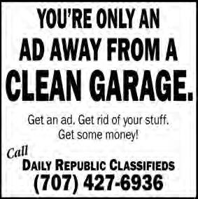 0103 LOST AND FOUND Disclaimer: LOST AND FOUND ads are published for 7 days - FREE. Call Daily Republic's Classified Advertising Dept. for details. (707) 427-6936 Mon.- Fri., 8am5pm CONTACT US FIRST Solano County Animal Shelter 2510 Claybank Rd Fairfield (707) 784-1356 so ano-shelter petfinder com Visit PetHarbor.com Uniting Pets & People 0107 SPECIAL NOTICES Disclaimer: Please Check Your Ad The First Day It Is Published and notify us immediately if there is an error. The Daily Republic is not responsible for errors or omissions after the first day of publication. The Daily Republic accepts no liability greater than the cost of the ad on the day there was an error or omission. Classified line ads that appear online hold no monetary value; therefore, they are not eligible for credit or a refund should they not appear online. 0201 REAL ESTATE SERVICE/LOANS Disclaimer: Fair Housing is the Law! The mission of the Department of Fair Employment and Housing is to protect the people of California from unlawful discrimination in employment, housing and public accommodations. The Daily Republic will not knowingly accept any ad which is in violation of the Federal Fair Housing Act and the California Fair Employment and Housing Act which ban discrimination based on race, color, national origin, sex, r eligion, sexual orientation, age, disability, familial status, and marital status. Describe the Property Not the Tenant 0343 ROOMS FOR RENT $725 mo. + $300 dep Shared utils. cable inc ld. Male prefd. N/S 707-514-8150. 0509 MISCELLANEOUS SERVICES DENTALINSURA NCEfromPhysic iansMutualInsura nceCompany C overagefor35 0 p lusprocedures R ealdentalinsura nce-NOTjust a d iscountplan.D o n otwait!Callnow ! G etyourFRE E D entalInformatio n K itwithallthedet ails! 1 -855-993-041 3 www.dental50plus.c om/republic#6258 Offer your home improvement expertise & services in Solano County's largest circulated newspaper. Achieve great results by advertising in Service Source Call M-F 9am-5pm (707) 427-6922 0509 MISCELLANEOUS SERVICES Up to $15,000.00 of GUARANTEED Life Ins urance! No medica l exam or health questions. Cash to help pay funeral and other final e xpenses.Call Physic ians Life Insuranc e C ompany- 866-6040 688 or visi t www.Life55plus.info/d ailyrep 0629 FIREWOOD Informational: A cord of wood shall measure 4x4x8 and be accompanied by a receipt. Please report any discrepancies to: The Department of Agricultural / Weights and Measures at (707) 784-1310 0631 FURN. & HSHLD. GOODS GENERAC Standby Generators provide backup power durin g utility power outages so your home and family stay safe an d comfortable. Prepare now. Free 7-year extended warranty ($695 value!). Request a free quote today! Call for additional terms and conditions. 1-707-7160674 The Generac PWRcell, a solar plus batter y storage system. SAVE m oney, reduce you r r eliance on the grid prepare for power outa ges and power you r home. Full installation services available. $ 0 D own financing Option. Request a FREE n o obligation, quot e today. Call 1-844-9232348 0633 GIVEAWAYS Disclaimer: GIVEAWAYS is FREE advertising for merchandise being given away by the advertiser (not for businesses, services or promotional use). Limited to 1 ad of like item(s) per customer in a 60 day period. 4 line max. for all ads. Ads are published for 3 consecutive days in the Daily Republic, 1 time in Friday's Tailwind. 4 1 yr old. German Sheprd. mix. Great family dogs. 707-337-1107 0633 GIVEAWAYS FREE WOOD PALLETS PICK UP AT BACK OF DAILY REPUBLIC 1250 TEXAS ST. TUESDAY - FRIDAY, 8AM -5PM. 1st COME, 1st SERVE 0639 LAWN & GARDEN Eliminate gutter cleaning forever! LeafFilter the most advance d debris-blocking gutter protection. Schedule a FREE LeafFilter estimate today. 15% off Entire Purchase. 10 % Senior & Military Discounts. Call 1-888652-3798 0640 MEDICAL EQUIP. & SUPPLIES Bariatric medical equipment, call fo r complete list, $500 707-429-0323 0641 MISC. FOR SALE OR TRADE SELL YOUR STUFF Daily Republic Classifieds dailyrepublic com 0645 MISC. WANTED DONATE YOUR CAR OR TRUCK TO HERITAGE FOR THE BLIND F ree 3 Day Vacation , T ax Deductible, Free Towing, All Paperwork Taken Care of. CALL 1-855-656-0695 0811 SUVS - 4WD 2003 Chevy Tahoe LT. All pwr., lthr., clean, v8 , 5.3 L, 183k mi C lean title & smog $ 6,900 obo DL R # 42203. (707)2806816 Quinterosautosales.com 0827 HONDA 2009 Piolet EX-L. A/T, v-6, all pwr., lthr., DVD Nav., moonroof. 121k mi. 2wd. $10,900 obo DLR #42203 (707)280-6816 Quinterosautosales.com 2014 Accord Sports. A/T, all pwr., great on gas, 4 cyl., 126k. New oil, tires, etc. $13,900 obo. DLR #42203