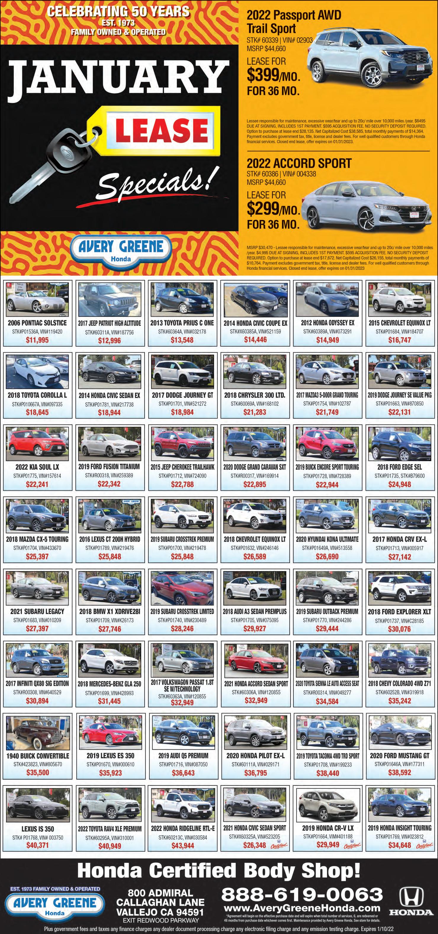 Classifieds: 707-427-6936 Online: dailyrepublic.com/classifieds Daily Republic - Friday, January 6, 2023 B5 SOME OF THE FINEST AUTO DEALERSHIPS IN THE AREA! TO ADVERTISE YOUR DEALERSHIP PLEASE CONTACT BILL AT 707-427-6937 Ford of Fairfield 3050 Auto Mall Court Fairfield (877) 475-0580 fordfairfield.com Look for your copy of our New Dealer Guide in this newspaper every Friday! Vacaville Honda 641 Orange Drive Vacaville (707) 449-5900 vacavillehonda.com HONDA Toyota Vallejo 201 Auto Mall Parkway Vallejo (707) 552-4545 toyotavallejo.com TOYOTA Vacaville VW 721 Orange Drive Vacaville (707) 449-6900 vacavillevw.com VOLKSWAGEN Lincoln Ford 3050 Auto Mall Court Fairfield (877) 475-0580 fordfairfield.com LINCOLN Avery Greene I-80 at Redwood Street Exit Vallejo (800) 707-4733 averygreenehonda.com HONDA FORD 0103 LOST AND FOUND Disclaimer: LOST AND FOUND ads are published for 7 days - FREE. Call Daily Republic's Classified Advertising Dept. for details. (707) 427-6936 Mon.- Fri., 8am5pm CONTACT US FIRST Solano County Animal Shelter 2510 Claybank Rd Fairfield (707) 784-1356 solano-shelter petfinder com Visit PetHarbor.com Uniting Pets & People 0107 SPECIAL NOTICES Disclaimer: Please Check Your Ad The First Day It Is Published and notify us immediately if there is an error. The Daily Republic is not responsible for errors or omissions after the first day of publication. The Daily Republic accepts no liability greater than the cost of the ad on the day there was an error or omission. Classified line ads that appear online hold no monetary value; therefore, they are not eligible for credit or a refund should they not appear online. 0201 REAL ESTATE