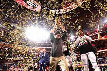 Jason Getz/The Atlanta Journal-Constitution/TNS Georgia coach Kirby Smart lifts the national championship trophy after his team’s win against TCU in the 2023 College Football Playoff final at SoFi Stadium in Inglewood, Monday.