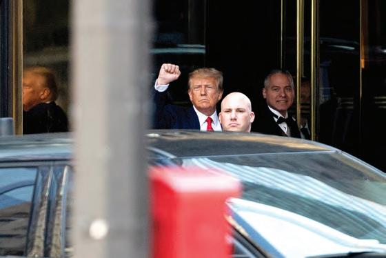 as he left Trump Tower on the way to the courthouse. Trump left New York immediately after the arraignment and flew to Mar-a-Lago, his Florida home and private club, where he was scheduled to address reporters this evening.