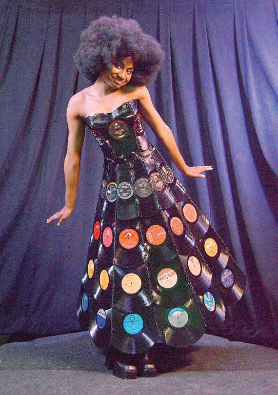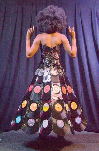 Diaz has created a grand dress completely made from vinyl records. Along with the dress are several other pieces all done with records.