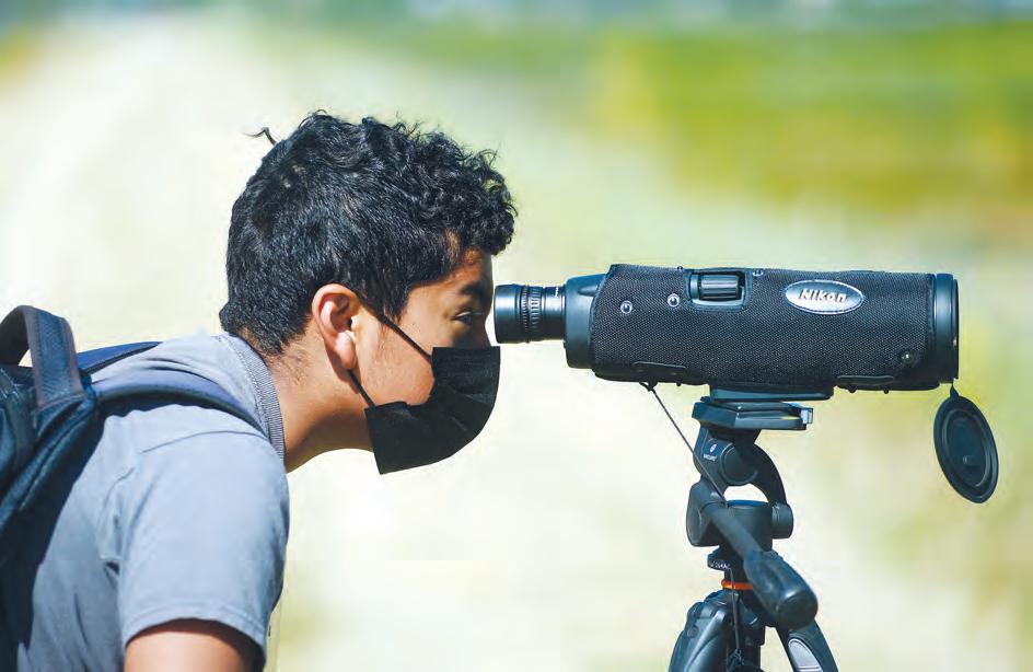 Julian Cortes, 10, a fifth-grader at Nelda Mundy Elementary School, uses a telescope to look at birds during a field trip to the proposed site of the Pacific Flyway Center in Fairfield, Wednesday.