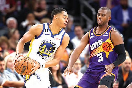 The Golden State Warriors’ Jordan Poole, left, handles the ball against the Phoenix Suns’ Chris Paul at Footprint Center in Phoenix, Oct. 25, 2022.