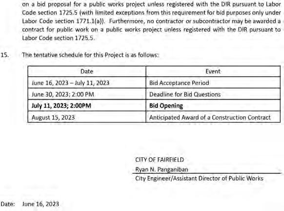 NOTICEOFRIGHTTOCLAIMEXCESSPROCEEDSFROMTHESALE OFTAX-DEFAULTEDPROPERTY ExcessproceedshaveresultedfromthesaleoftaxdefaultedpropertylistedonthisnoticeonMay9-11,2023.Partiesofinterest,asdefinedbyCaliforniaRevenueandTaxationCodesection4675,areentitledtoclaimtheexcessproceeds. Allclaimsmustbeinwritingandmustcontainsufficientinformationandprooftoestablishaclaimant'srighttoalloranypartoftheexcessproceeds. Claimsfiledwiththe countymorethanoneyearafterrecordationofthetaxcollector'sdeedtothepurchaser onMay24,2023cannotbeconsidered. Assessor’sParcelNoPropertyAddress PartiesofInterest_ 0075-091-350514RIDGEAVENUE,UNINCORPORATEDCOUNTYOFSOLANO DARYLHINTON ClaimformsandinformationregardingfilingproceduresmaybeobtainedattheSolano CountyTreasurer-TaxCollector-CountyClerk’sOffice,675TexasStreet,Suite1900, Fairfield,CA94533,bycalling(707)784-7485between10:00a.m.and3:00p.m.Monday throughFridayoratwww.solanocounty.com. Icertifyunderpenaltyofperjurythattheforegoingistrueandcorrect. CHARLESLOMELI,SolanoCounty Treasurer-TaxCollector-CountyClerk ExecutedatFairfield,SolanoCounty,CaliforniaonJune23,2023 DR#00064051 Published:June23,30July7,2023 NOTICEOFTRUSTEE'SSALET.S.No.22-02247-QQ-CATitleNo.230086502-CA-VOI A.P.N.0037-282-170YOUAREINDEFAULTUNDERADEEDOFTRUSTDATED 08/14/2017.UNLESSYOUTAKEACTIONTOPROTECTYOURPROPERTY,ITMAY BESOLDATAPUBLICSALE.IFYOUNEEDANEXPLANATIONOFTHENATUREOF THEPROCEEDINGAGAINSTYOU,YOUSHOULDCONTACTALAWYER.Apublic auctionsaletothehighestbidderforcash,(cashier'scheck(s)mustbemadepayableto NationalDefaultServicingCorporation),drawnonastateornationalbank,acheckdrawn byastateorfederalcreditunion,oracheckdrawnbyastateorfederalsavingsandloan association,savingsassociation,orsavingsbankspecifiedinSection5102oftheFinancialCodeandauthorizedtodobusinessinthisstate;willbeheldbythedulyappointed trusteeasshownbelow,ofallright,title,andinterestconveyedtoandnowheldbythe trusteeinthehereinafterdescribedpropertyunderandpursuanttoaDeedofT rustdescribedbelow.Thesalewillbemadeinan"asis"condition,butwithoutcovenantorwarranty,expressedorimplied,regardingtitle,possession,orencumbrances,topaytheremainingprincipalsumofthenote(s)securedbytheDeedofTrust,withinterestandlate chargesthereon,asprovidedinthenote(s),advances,underthetermsoftheDeedof Trust,interestthereon,fees,chargesandexpensesoftheTrusteeforthetotalamount(at thetimeoftheinitialpublicationoftheNoticeofSale)reasonablyestimatedtobeset forthbelow.Theamountmaybegreateronthedayofsale.Trustor:CatherineLockett,a singlewomanDulyAppointedTrustee:NationalDefaultServicingCorporationRecorded 08/17/2017asInstrumentNo.201700069308(orBook,Page)oftheOfficialRecordsof SolanoCounty,California.DateofSale:07/20/2023at09:30AMPlaceofSale:Atthe SantaClaraStreetentrancetotheCityHall,555SantaClaraStreet,Vallejo,CA94590 Estimatedamountofunpaidbalanceandothercharges:$280,165.56StreetAddressor othercommondesignationofrealproperty:912BrandonWay,Fairfield,CA94533-4155 A.P.N.:0037-282-170TheundersignedTrusteedisclaimsanyliabilityforanyincorrectnessofthestreetaddressorothercommondesignation,ifany,shownabove.Ifnostreet addressorothercommondesignationisshown,directionstothelocationoftheproperty maybeobtain edbysendingawrittenrequesttothebeneficiarywithin10daysofthedate offirstpublicationofthisNoticeofSale.IftheTrusteeisunabletoconveytitleforany reason,thesuccessfulbidder'ssoleandexclusiveremedyshallbethereturnofmonies paidtotheTrustee,andthesuccessfulbiddershallhavenofurtherrecourse.TherequirementsofCaliforniaCivilCodeSection2923.5(b)/2923.55(c)werefulfilledwhenthe NoticeofDefaultwasrecorded.NOTICETOPO TENTIALBIDDERS:Ifyouareconsideringbiddingonthispropertylien,youshouldunderstandthattherearerisksinvolvedin biddingatatrusteeauction.Youwillbebiddingonalien,notonthepropertyitself.Placingthehighestbidatatrusteeauctiondoesnotautomaticallyentitleyoutofreeand clearownershipoftheproperty.Youshouldalsobeawarethatthelienbeingauctioned offmaybeajuniorlien.Ifyouarethehighestbidderattheauction,youareormayber esponsibleforpayingoffallliensseniortothelienbeingauctionedoff,beforeyoucanreceivecleartitletotheproperty.Youareencouragedtoinvestigatetheexistence,priority, andsizeofoutstandingliensthatmayexistonthispropertybycontactingthecountyrecorder'sofficeoratitleinsurancecompany,eitherofwhichmaychargeyouafeeforthis information.Ifyouconsulteitheroftheseresources,youshouldbeawarethatthesame lendermayholdmore thanonemortgageordeedoftrustontheproperty.NOTICETO PROPERTYOWNER:Thesaledateshownonthisnoticeofsalemaybepostponedone ormoretimesbythemortgagee,beneficiary,trustee,oracourt,pursuanttoSection 2924goftheCaliforniaCivilCode.Thelawrequiresthatinformationabouttrusteesale postponementsbemadeavailabletoyouandtothepublic,asacourtesytothosenot presentatthesale.Ifyouwishtolearnwhetheryoursaledatehasbeenpostponed, and, ifapplicable,therescheduledtimeanddateforthesaleofthisproperty,youmaycall 714-730-2727orvisitthisinternetwebsitewww.ndscorp.com/sales,usingthefilenumber assignedtothiscase22-02247-QQ-CA.Informationaboutpostponementsthatarevery shortindurationorthatoccurcloseintimetothescheduledsalemaynotimmediatelybe reflectedinthetelephoneinformationorontheinternetwebsite.Thebestwaytoverify postponementinformation istoattendthescheduledsale.NOTICETOTENANT*:You mayhavearighttopurchasethispropertyafterthetrusteeauctionpursuanttoSection 2924moftheCaliforniaCivilCode.Ifyouarea"representativeofalleligibletenantbuyers"youmaybeabletopurchasethepropertyifyoumatchthelastandhighestbid placedatthetrusteeauction.Ifyouarean"eligiblebidder,"youmaybeabletopurchase thepropertyifyouexceedthelastandhighestbidplacedatthetrusteeauction.There arethreestepstoexercisingthisrightofpurchase.First,48hoursafterthedateofthe trusteesale,youcancall888-264-4010,orvisitthisinternetwebsitewww.ndscorp.com, usingthefilenumberassignedtothiscase22-02247-QQ-CAtofindthedateonwhich thetrustee'ssalewasheld,theamountofthelastandhighestbid,andtheaddressofthe trustee.Second,youmustsendawrittennoticeofintenttoplaceabidsothatthetrustee receivesitnomorethan15daysafte