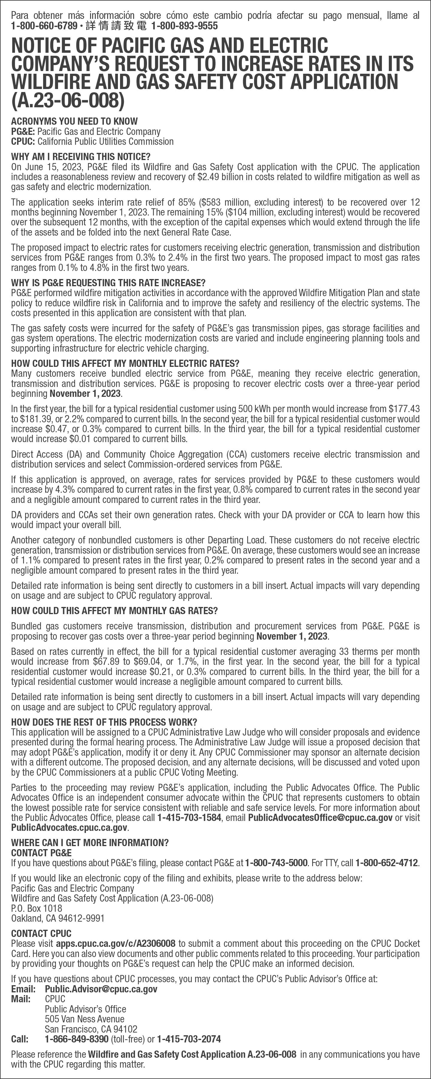 granting of the petition, you should appear at the hearing and state your objections or file wr tten objections with the court before the hearing Your appearance may be in person or by your attorney If you are a creditor or a contingent creditor of the decedent you must file your claim with the court and mail a copy to the personal representative appointed by the court within the later of either (1)four months from the date of first issuance of letters to a general personal representative as defined in section 58(b) of the California Probate Code or (2) 60 days from the date of mailing or personal delivery to you of a notice under section 9052 of the California Probate Code Other California statutes and legal authority may affect your rights as a creditor You may want to consult with an attorney knowledgeable in California law You may examine the file kept by the court If you are a person interested in the estate you may file with the court a Request for Special Notice (form DE-154) of the filing of an inventory and appraisal of estate assets or of any petition or account as provided in Probate Code section 1250 A Request for Special Notice form is available from the court clerk Petitioner: 115 Van R pper Lane Orinda Ca 94563 (925) 348-0975 DR#00064246 Published: June 28 July 2 5 2023 NOTIFICACIÓN DE CONCLUSIÓN DE IMPACTO NO SIGNIFICATIVO Y NOTIFICACIÓN DE INTENCIÓN DE SOLICITAR LIBERACIÓN DE FONDOS