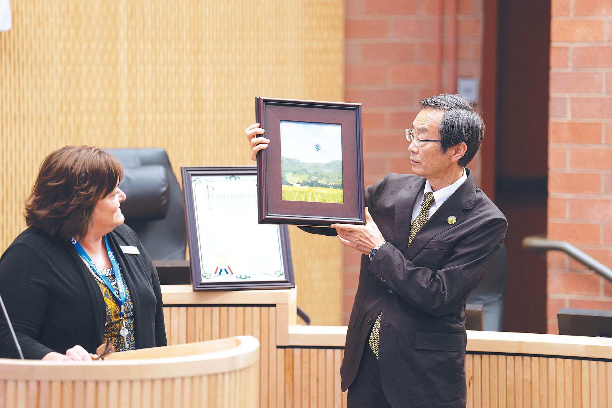 Bill Way/City of Fairfield courtesy photo Mayor Hisao Naito of Nirasaki, Japan, holds a painting given by Mayor Cat Moy at the Fairfield City Council