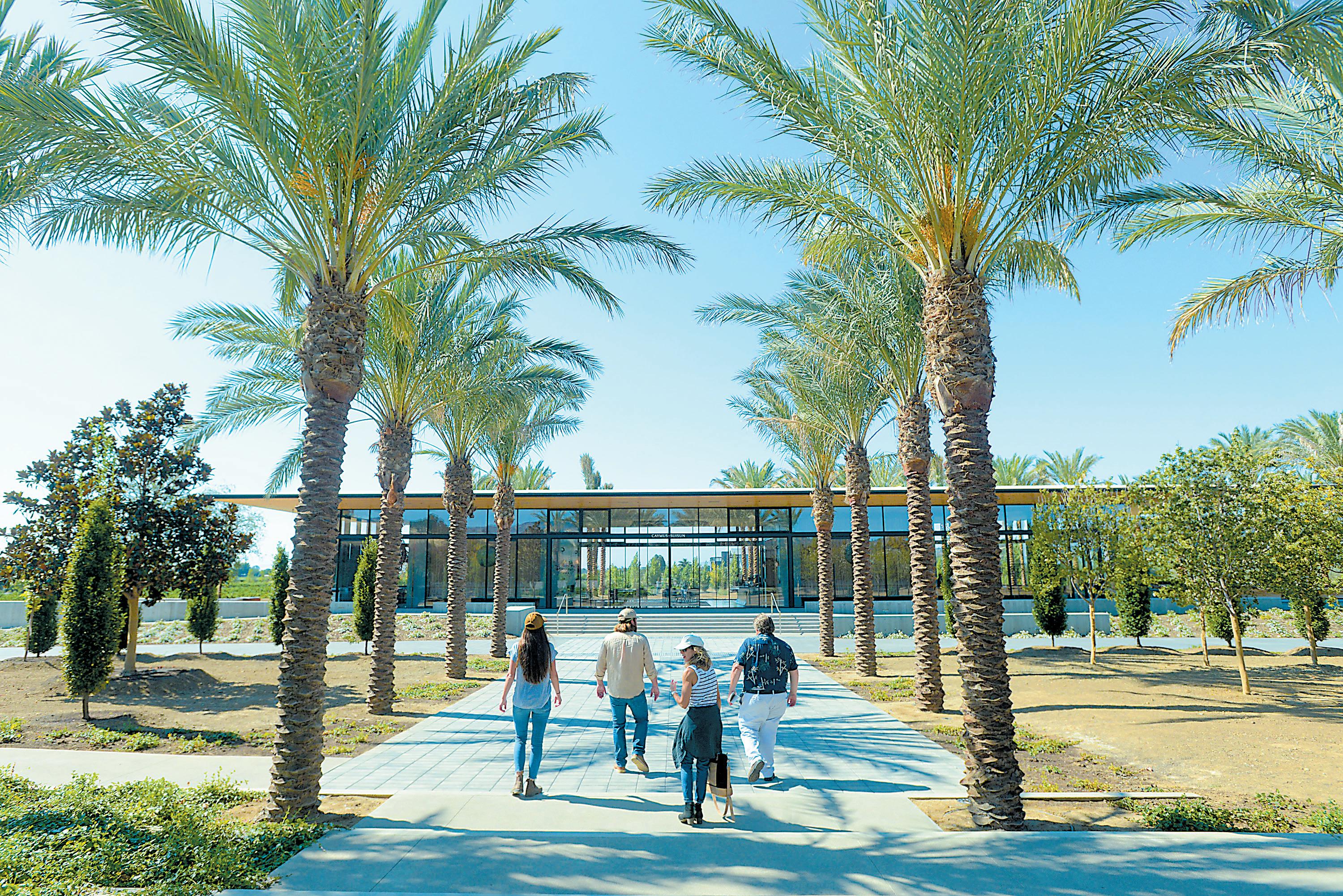 The glass walls of the tasting building open to those winds, and the outdoor spaces are breezy and show off how the wind caresses the trees and foliage. The winery has already held events during which long tables were placed on a walk way lined by palms on either side.