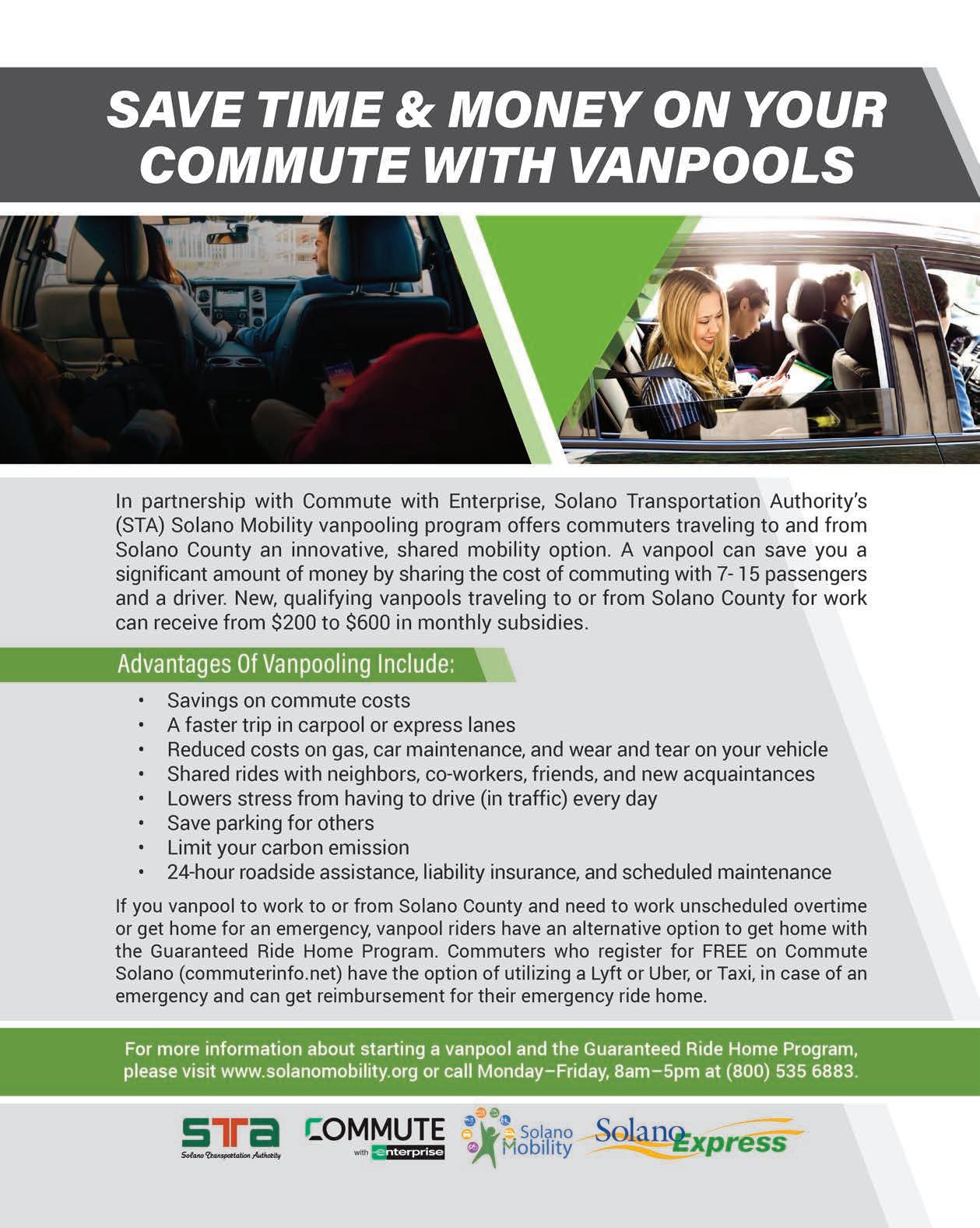 15 people who live and work near you. Forming a vanpool is a great way to share the cost of commuting. New, qualifying vanpools traveling to or from Solano County for work can receive from $200 to $600 in monthly subsidies. Twenty new vanpools have recently taken advantage of this program traveling from Benicia, Dixon, Fairfield, Vacaville and Vallejo to Richmond, San Francisco, St. Helena and Treasure Island.