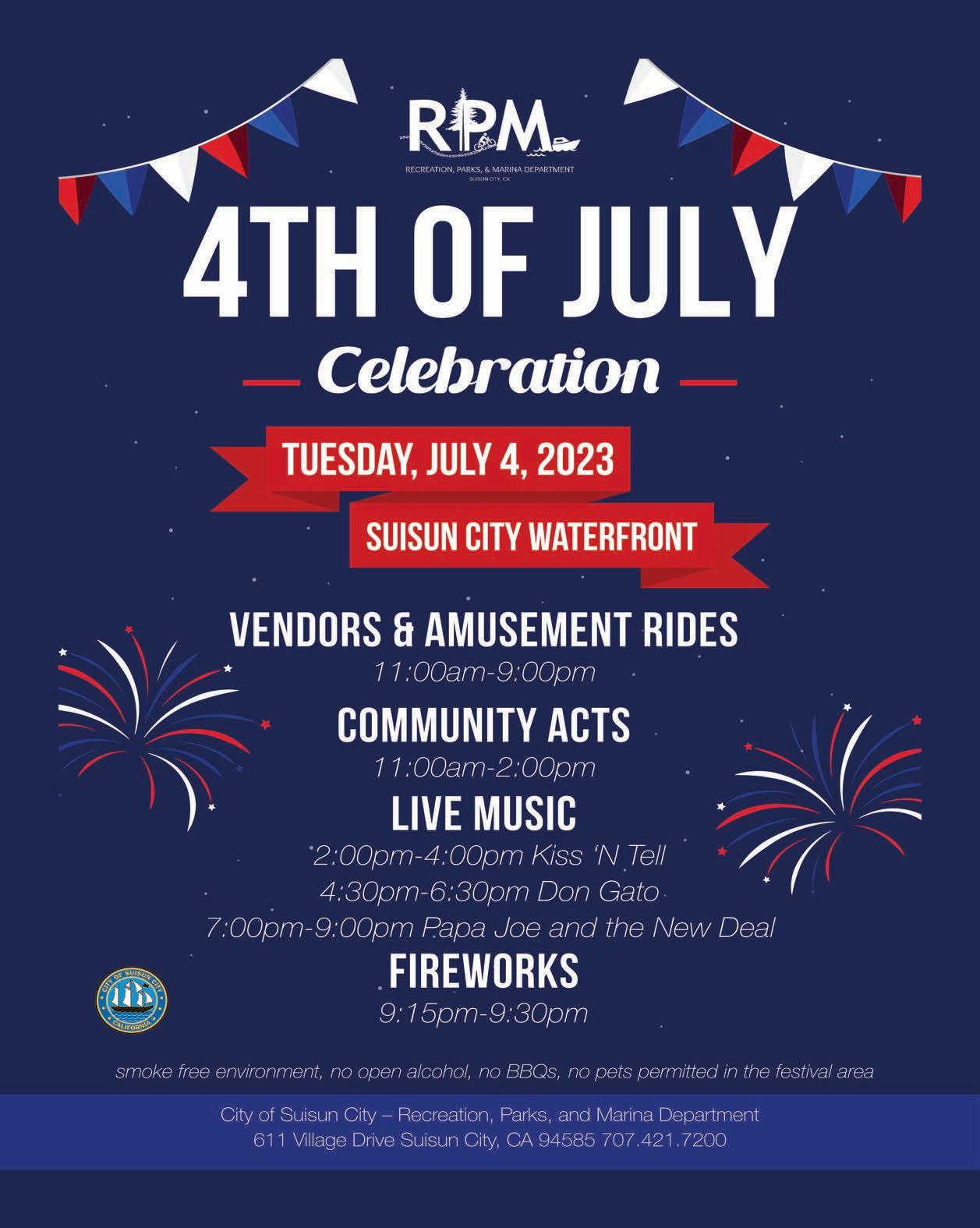 FOURTH OF JULY CELEBRATION: Suisun City celebrates in the afternoon with a festival along the waterfront with live entertainment and vendors, and culminates with an evening fireworks show over the Suisun Marina. www.suisun.com/ suisun-city-to-host-4th-of-julycelebration