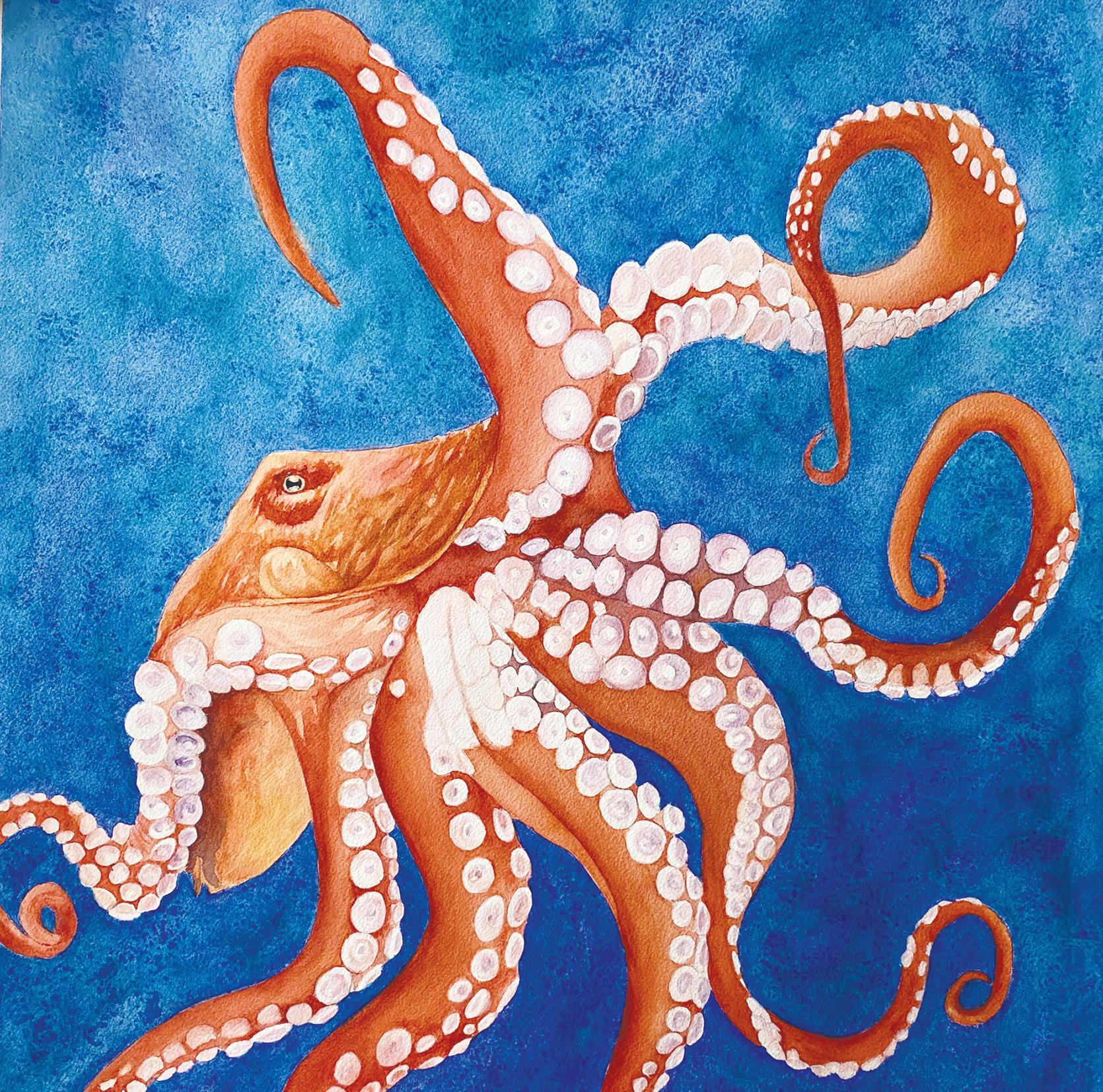 After repeatedly failing to capture a clear image of the shy creature, Major encountered another artist during a studio tour who happened to have a photograph of Tino fully visible. From that image, Major created her painting of the octopus in motion. Major’s awardwinning artwork is held in many private collections. She continues to work on her nature “portrait” series, emphasizing details of flora and fauna, with a focus on marine life, birds and animals, and the occasional landscape.