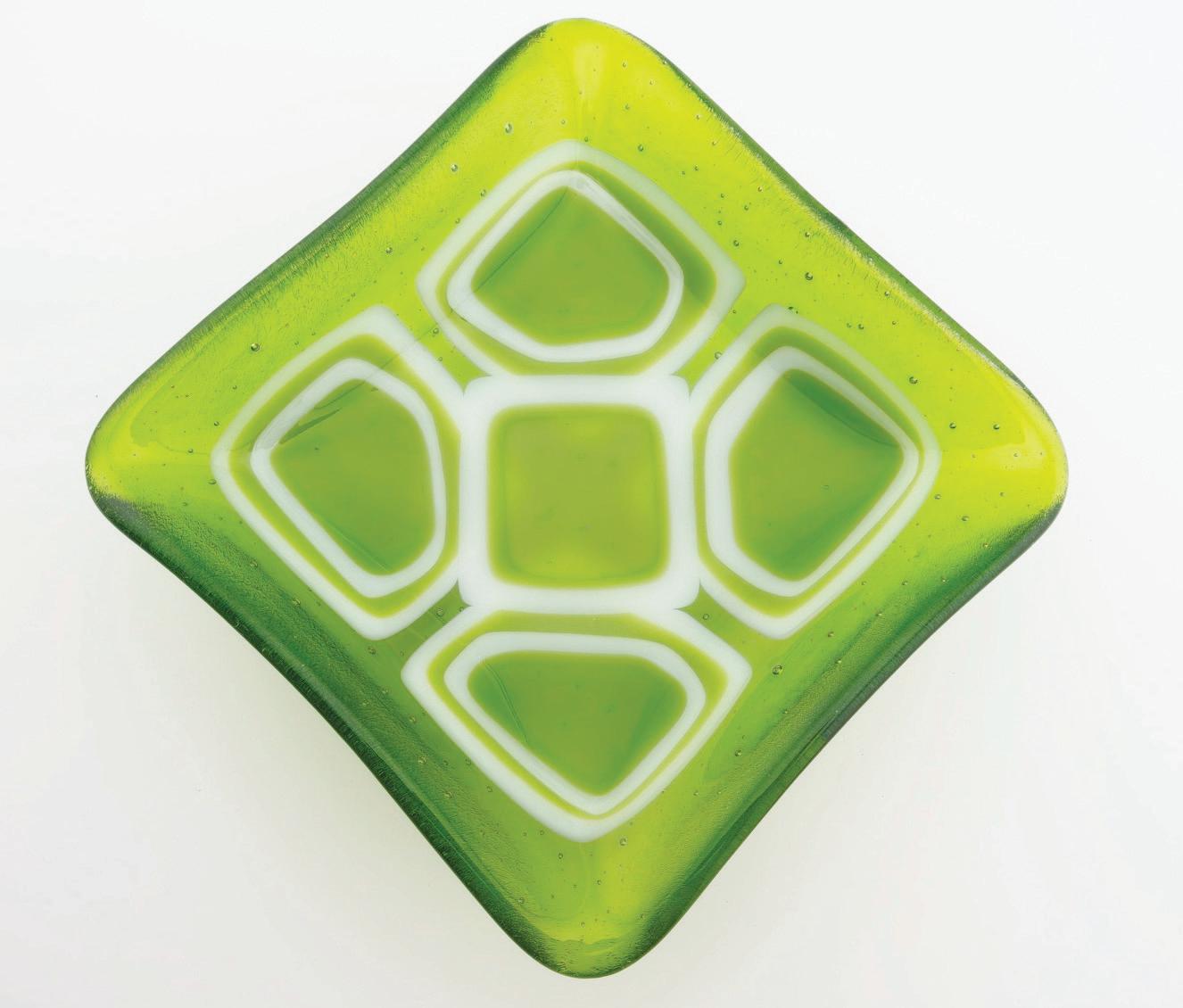 Brickey grew up on a small farm in California’s Central Valley, surrounded by nature, an influence that shaped her 35-year career as a wildlife conservationist. After retiring, she discovered a passion for kilnformed glass. What began as a casual activity with a friend developed into a serious pursuit, resulting in a body of work reflecting contemporary influences and her own evolving style. Her pieces often feature complex geometric designs with intricate three-dimensional e ects, vivid saturated colors and a sense of whimsy.