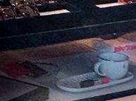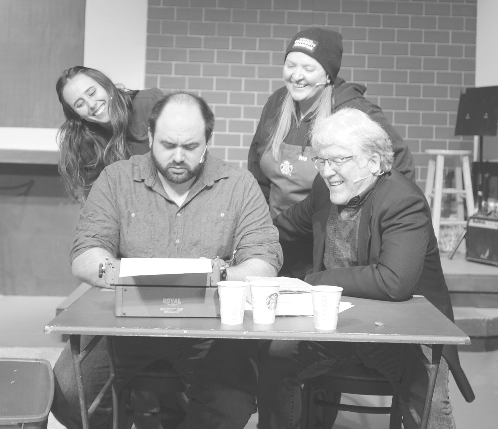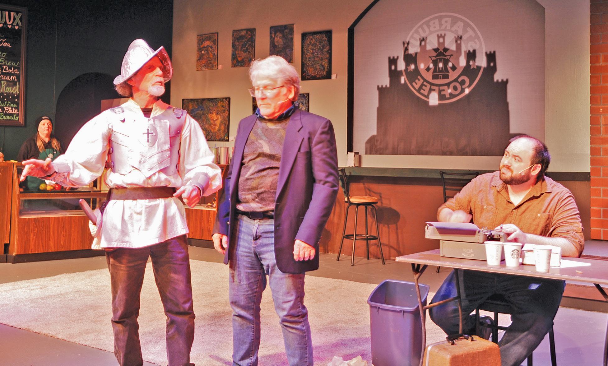 Above, Don Quixote (Dan Trainor) is looking rather quixotic, an eponym derived from his name in the 18th century meaning exceedingly idealistic; unrealistic and impractical. Below, Starbucks patron (Andreanna Cole) and Barista (Brody Lorda) are fascinated by Ben’s (Odin Rasco) inability to finish the script that he’s been working on for far too long despite his agent’s (Dave Zarka) encouragment.