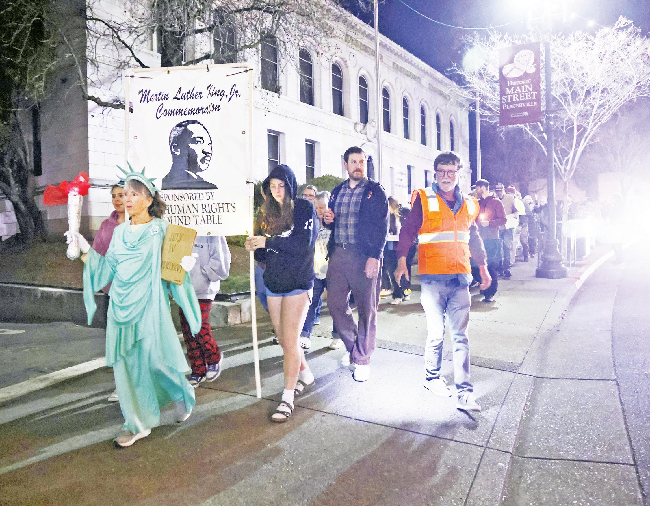 Vicky Vail of Placerville carries a torch as Lady Liberty and together with flashlight wielding Keith Atwater, of Lotus, right, they lead marchers downtown in a walk to honor the legacy of Dr. Martin Luther King Jr. on Jan. 17.