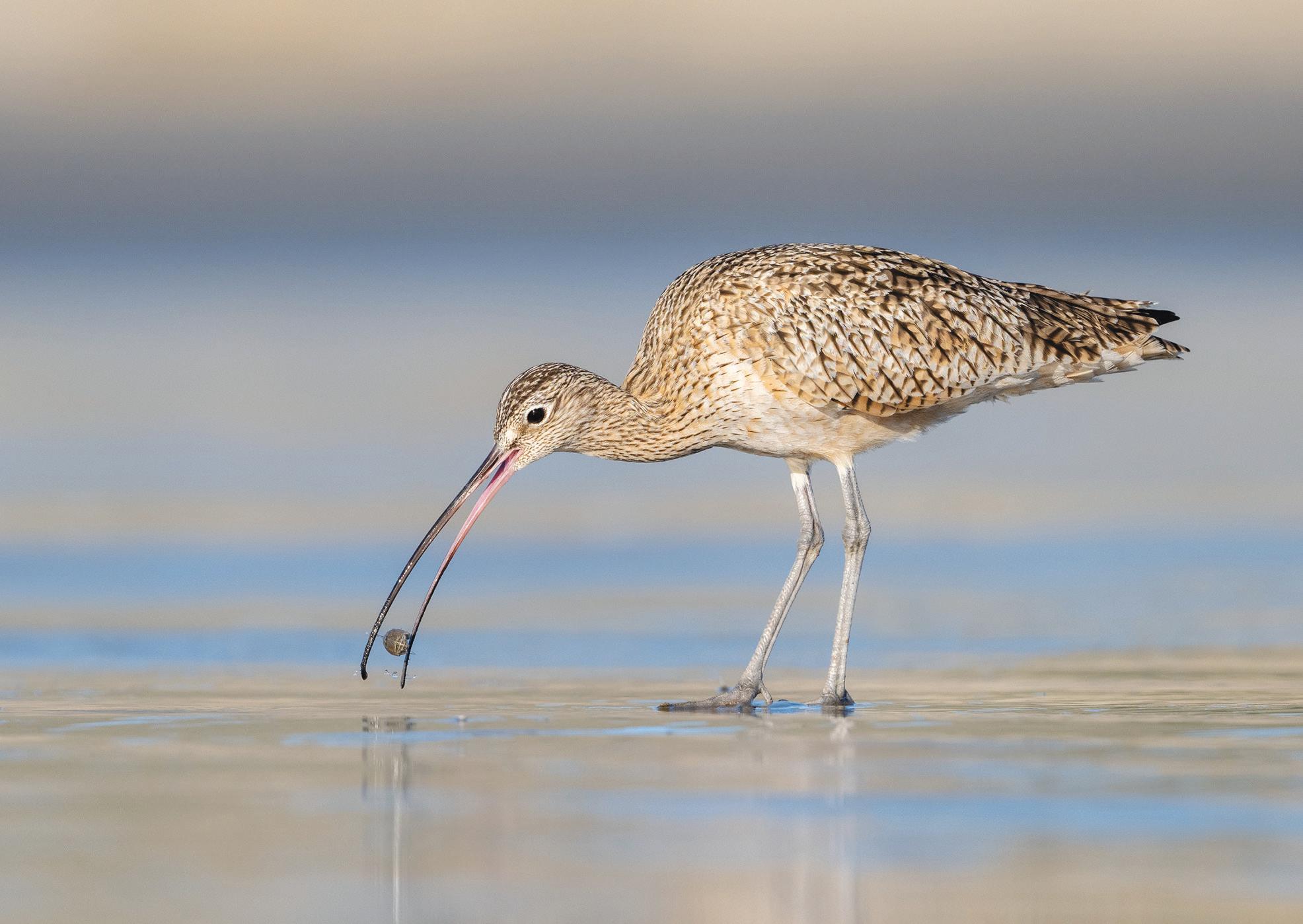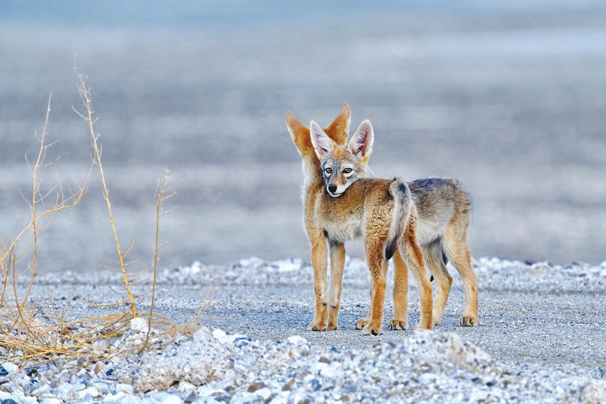 image of coyote pup siblings taken at Owens Lake, Inyo County and Jacqueline Deely's photo of the long-billed Curlew with a sand crab taken at Morro Bay State Park, San Luis