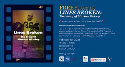 Lines Broken: The Story of Marion MotleyFree Screening @ 2pm / Free Join us for a free screen‐ing of the award winning PBS documentary Lines Broken, the inspiring story of football legend Marion Motley! Kroc Center, 586 East Wigeon Way, Suisun City. show@eddrick.com