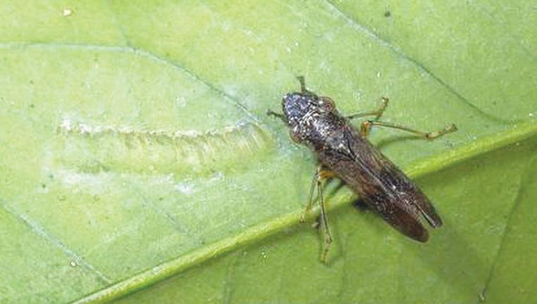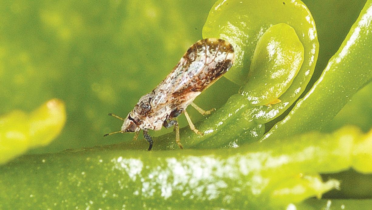 The Asian citrus psyllid arrived in Southern California in 2008. The insect spreads huanglongbing, also known as HLB, a fatal citrus tree disease. After feeding on infected plant tissue, the psyllid can transmit the HLB bacteria to healthy trees, allowing the disease to spread. More information is available at ipm.ucanr.edu/PMG/ PESTNOTES/pn74155. html.
