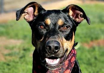 More playful pal than spider-man. M Dobie mix 4 yr. black/red.