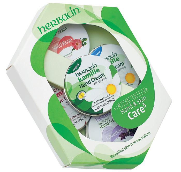 This Hand & Skin Care 5 Tin Set of trial-size containers is perfect for on-the-go skin protection. Each tin provides hands and skin with natural all-round protection free from parabens, mineral oil, animal byproducts or synthetic colors with Herbacin Hand Cream in original, unscented and intensive moisture formulas, and Wellness Hand Cream in wild rose and lavender.