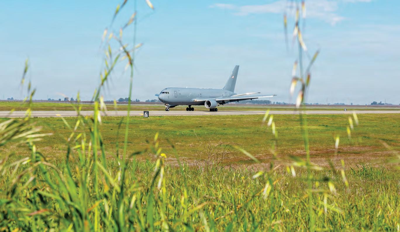 Col. Nelson Prouty, right, 60th Air Mobility Wing deputy commander, presents Col. Travis Bohanan, 60th Maintenance Group commander, with a plaque after flying a newly acquired KC-46A Pegasus on the flight line at Travis AFB, Feb. 6.