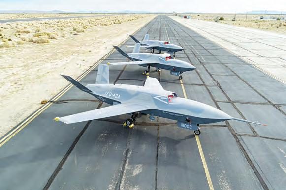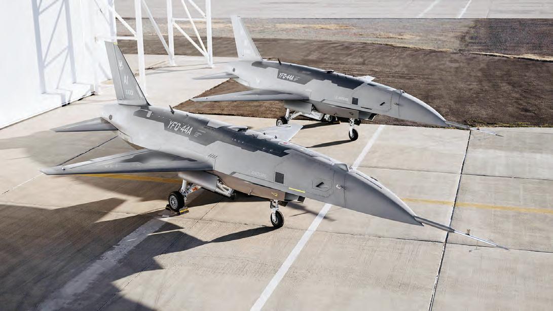 YFQ-44 aircraft are parked on the flightline for the Air Force’s Collaborative Combat Aircraft program at a California test location. The CCA initiative is transforming